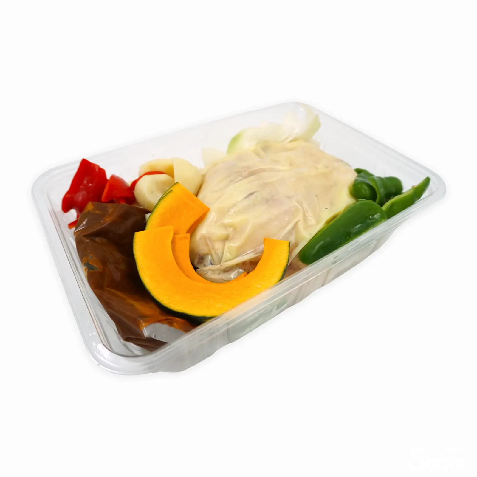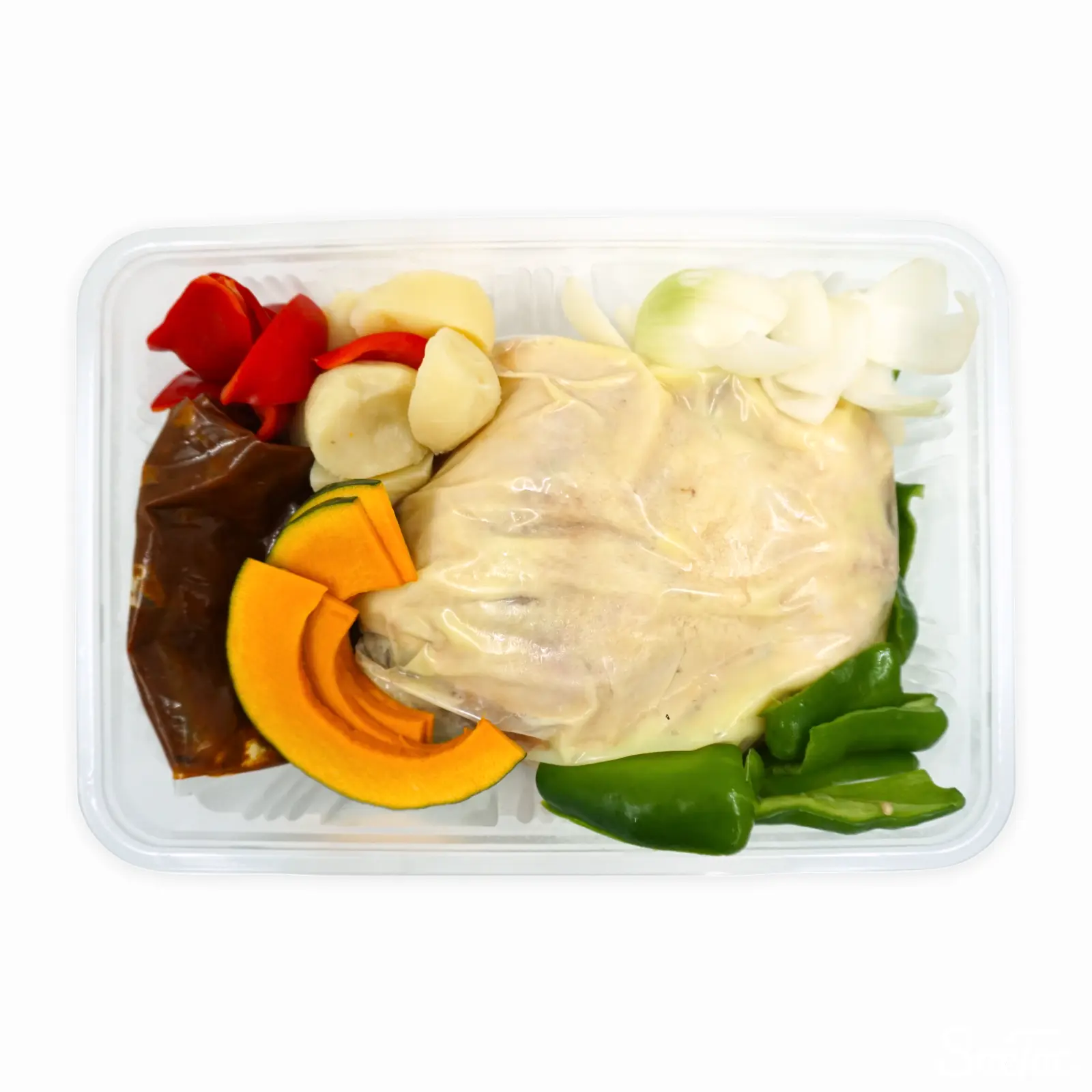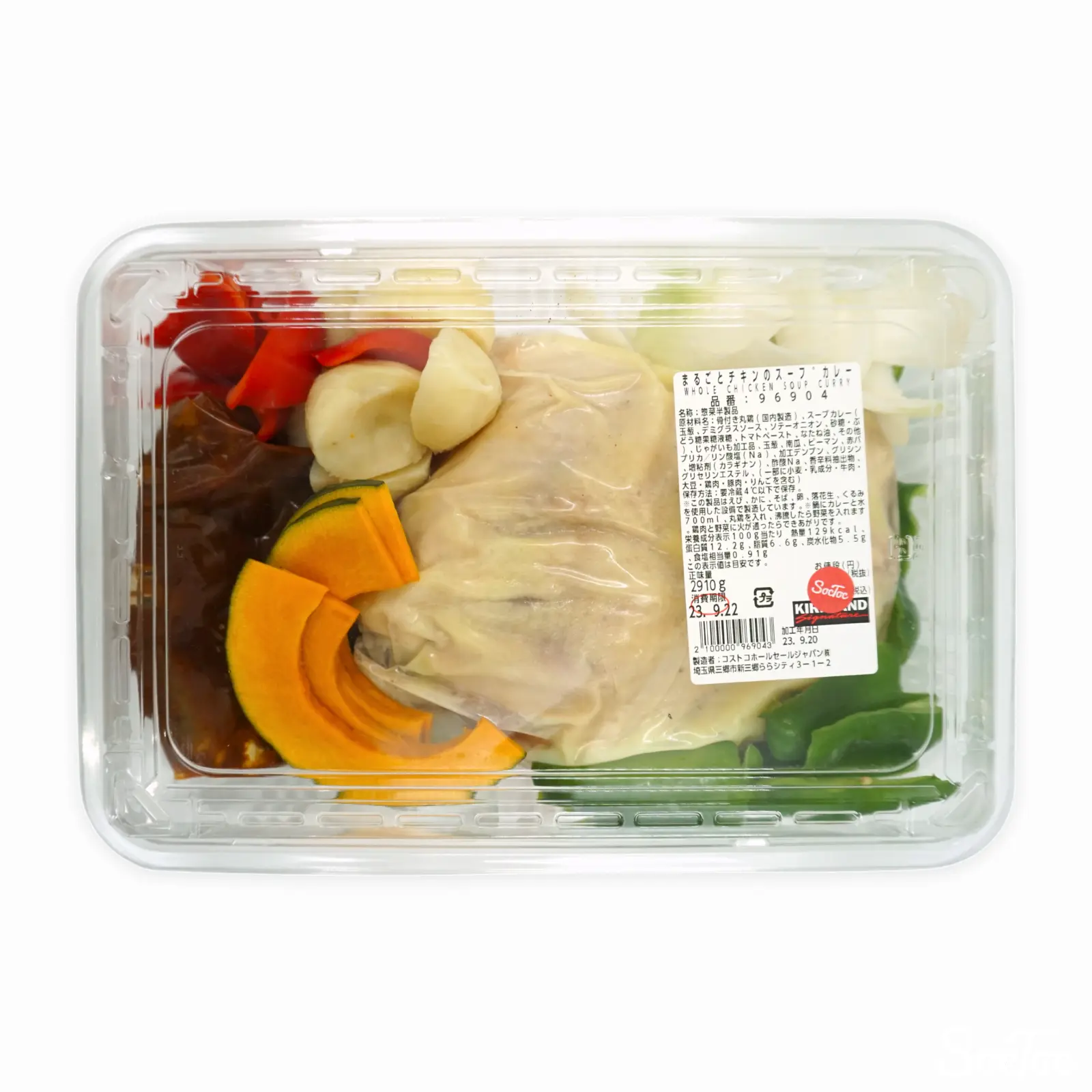 チキンがまるごと入った調理前のスープカレーセットです。塊のチキンのほか、かぼちゃ、ピーマン、じゃがいも、玉ねぎなどの野菜が入っており、大きめの鍋で煮込んで完成となります。