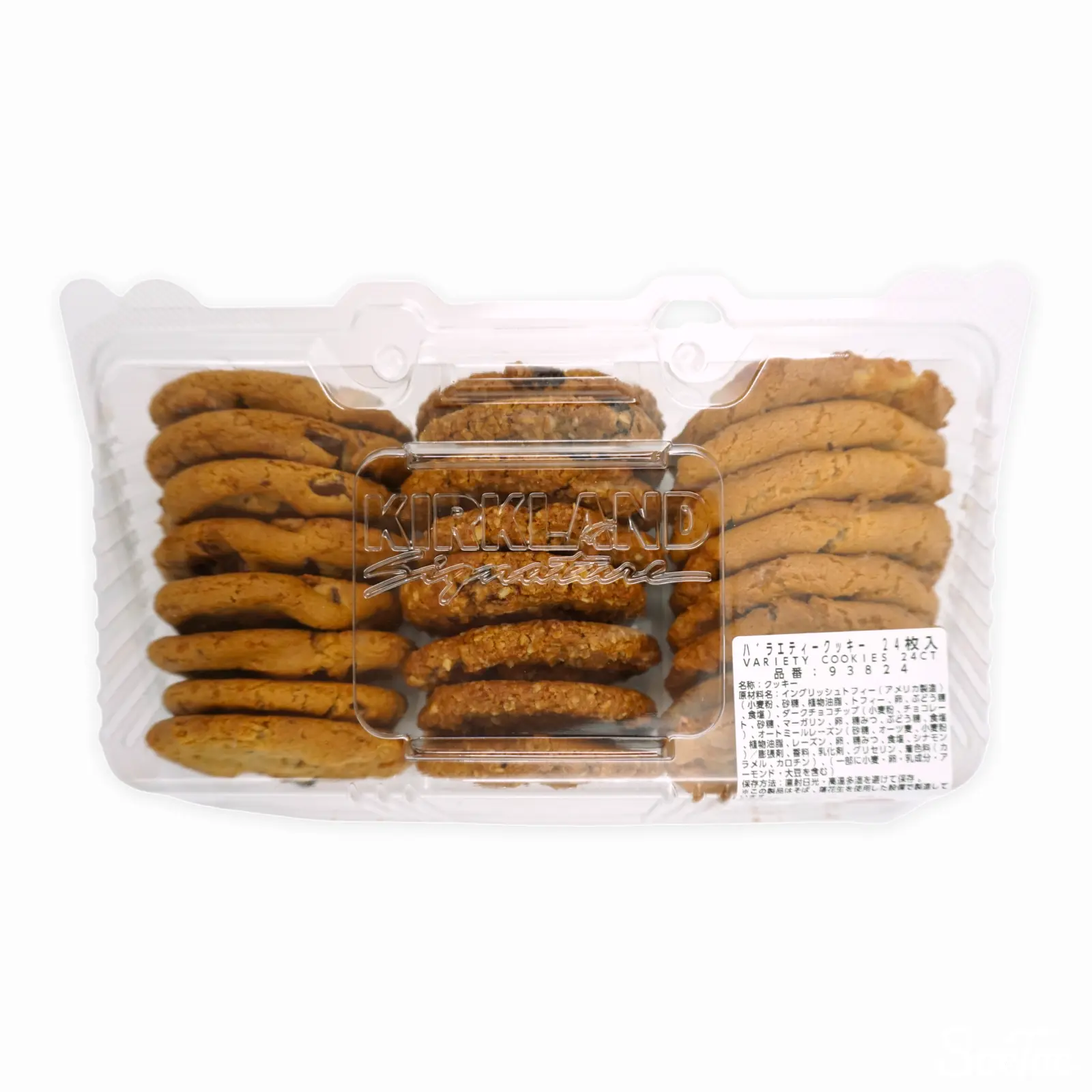 | 原材料名 | イングリッシュトフィー(アメリカ製造)(小麦粉、砂糖、植物油脂、トフィー、卵、ぶどう糖、食塩)、ダークチョコチップ(小麦粉、チョコレート、砂糖、マーガリン、卵、糖みつ、ぶどう糖、食塩)、オートミールレーズン(砂糖、オーツ麦、小麦粉、植物油脂、レーズン、卵、糖みつ、食塩、シナモン)/膨張剤、香料、乳化剤、グリセリン、着色料(カラメル、カロチン)、(一部に小麦・卵・乳成分・アーモンド・大豆を含む) |