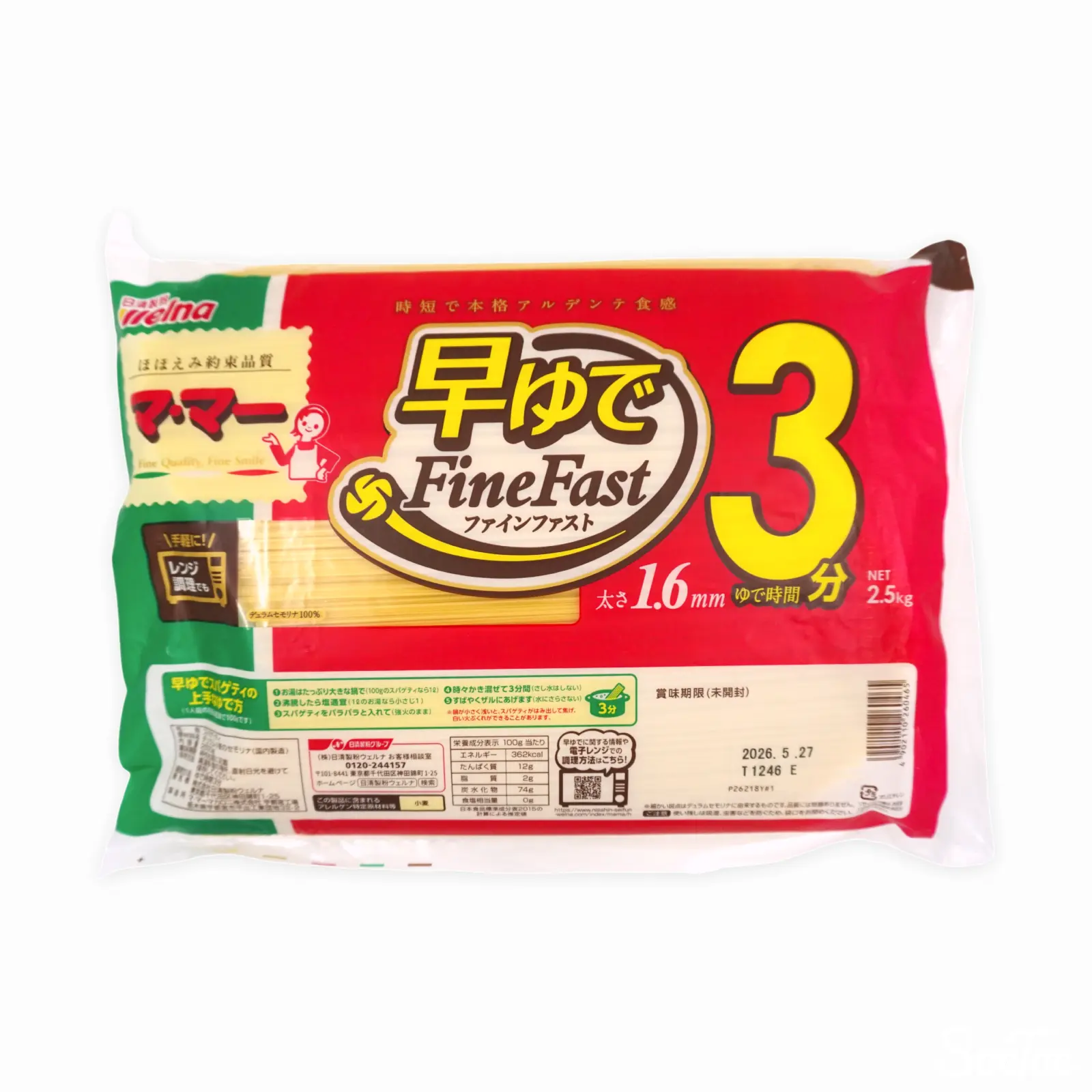 日清フーズの早湯でスパゲティ2,500g入り大容量パックです。1.6mm太さのスパゲティ麺が3分で茹で上がります。