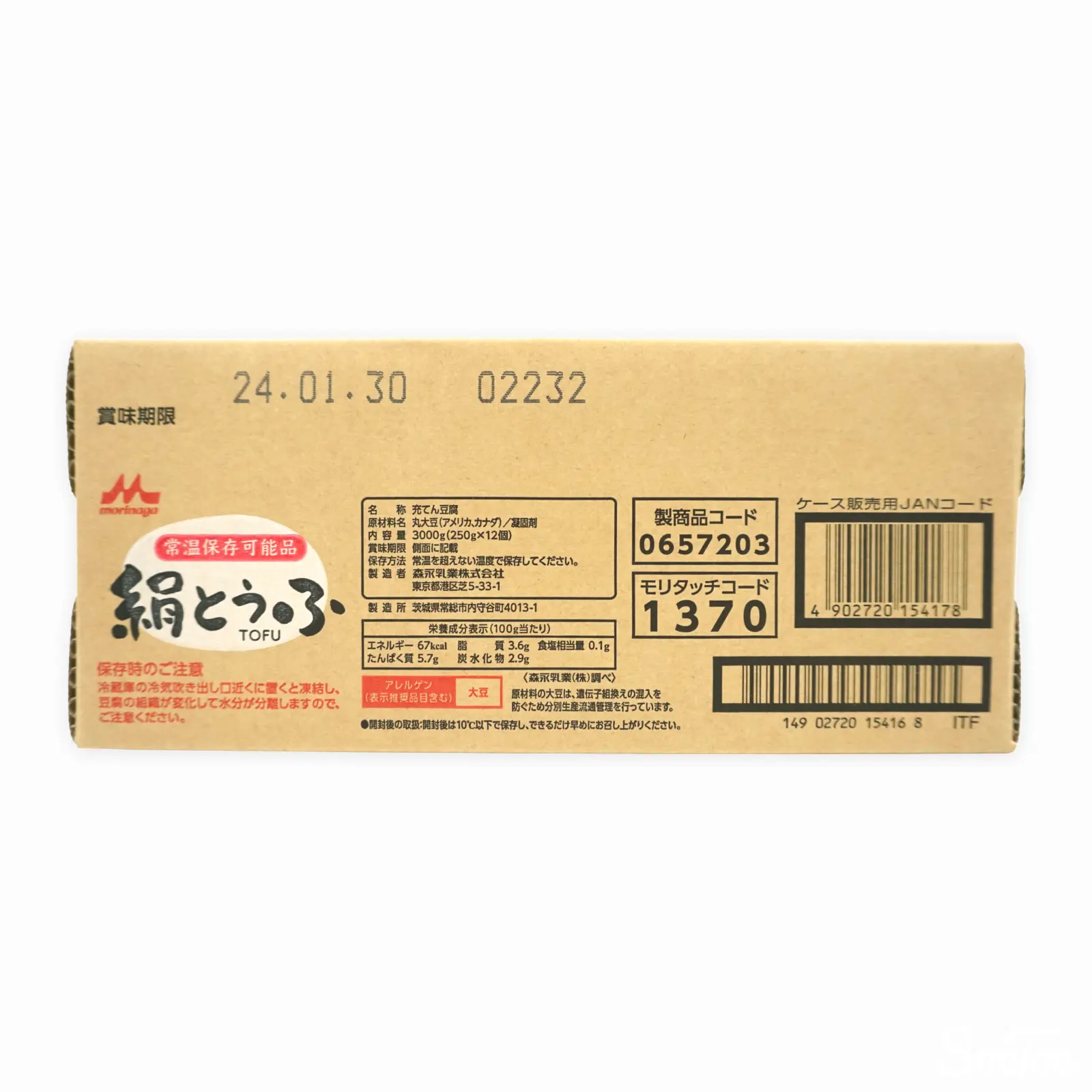 常温保存ができる絹豆腐です。半丁より少し大きめの250gサイズが12パック分入っています。