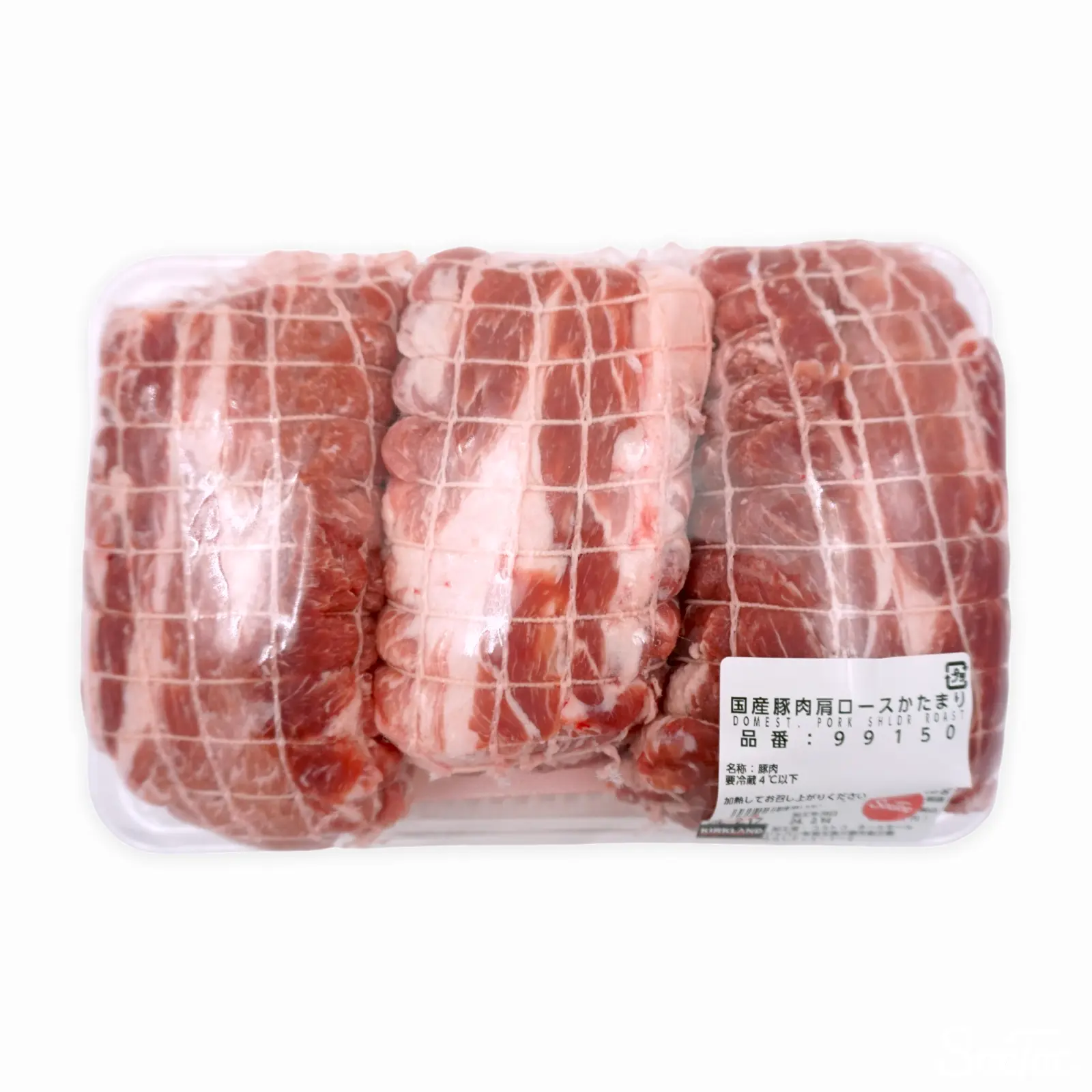 国産豚肉の肩ロース塊です。紐に縛ってある状態になります。