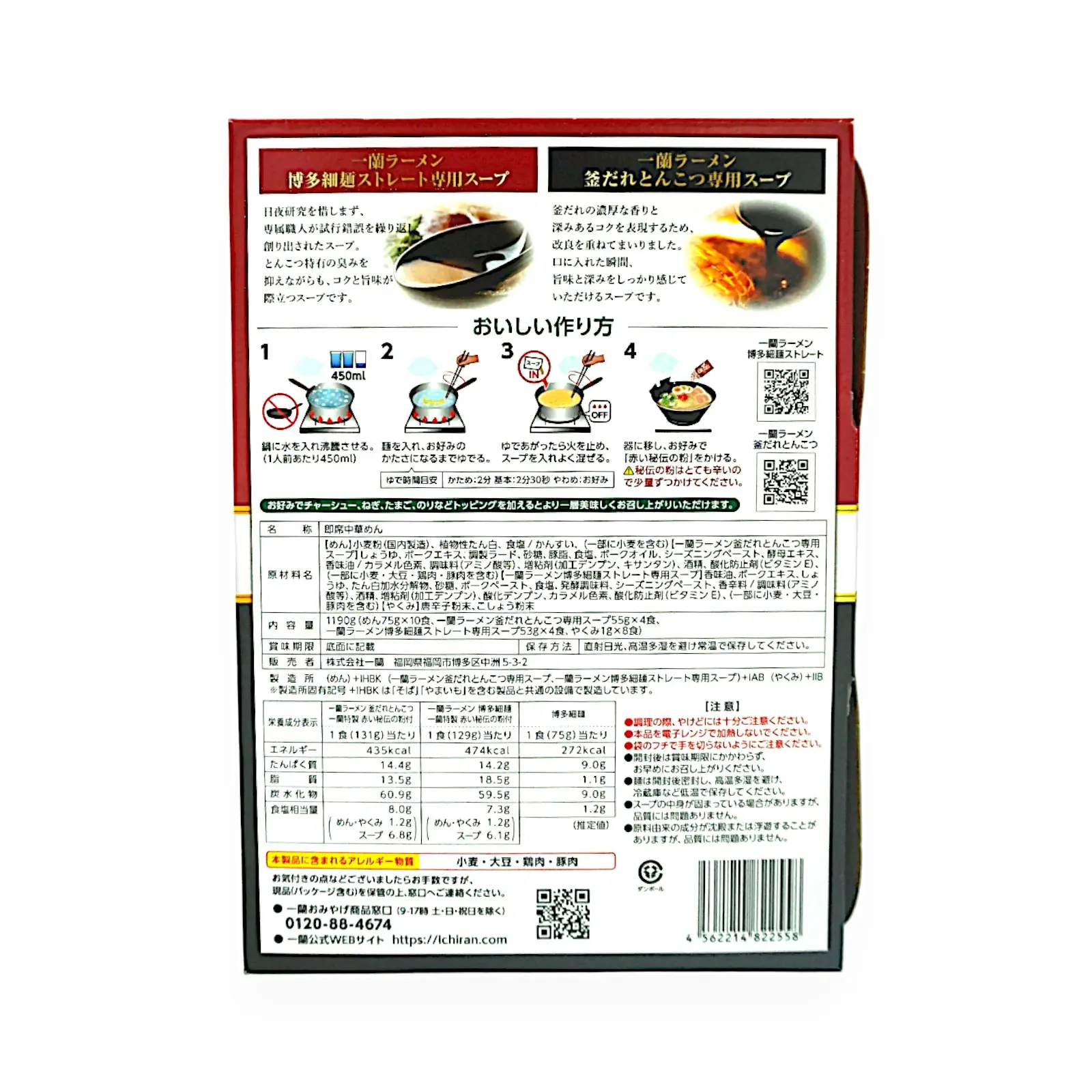 | 原材料名 | 【めん】小麦粉(国内製造)、植物性たん白、食塩/かんすい、(一部に小麦を含む)【一蘭ラーメン釜だれとんこつ専用スープ】しょうゆ、ポークエキス、調製ラード、砂糖、豚脂、食塩、ポークオイル、シーズニングペースト、酵母エキス、香味油/カラメル色素、調味料(アミノ酸等)、増粘剤(加工デンプン、キサンタン)、酒精、酸化防止剤(ビタミンE)、(一部に小麦・大豆・鶏肉・豚肉を含む)【一蘭ラーメン博多細麺ストレート専用スープ】香味油、ポークエキス、しょうゆ、たん白加水分解物、砂糖、ポークペースト、食塩、発酵調味料、シーズニングペースト、香辛料/調味料(アミノ酸等)、酒精、増粘剤(加工デンプン)、酸化デンプン、カラメル色素、酸化防止剤(ビタミンE)、(一部に小麦・大豆・豚肉を含む)【やくみ】唐辛子粉末、こしょう粉末 |