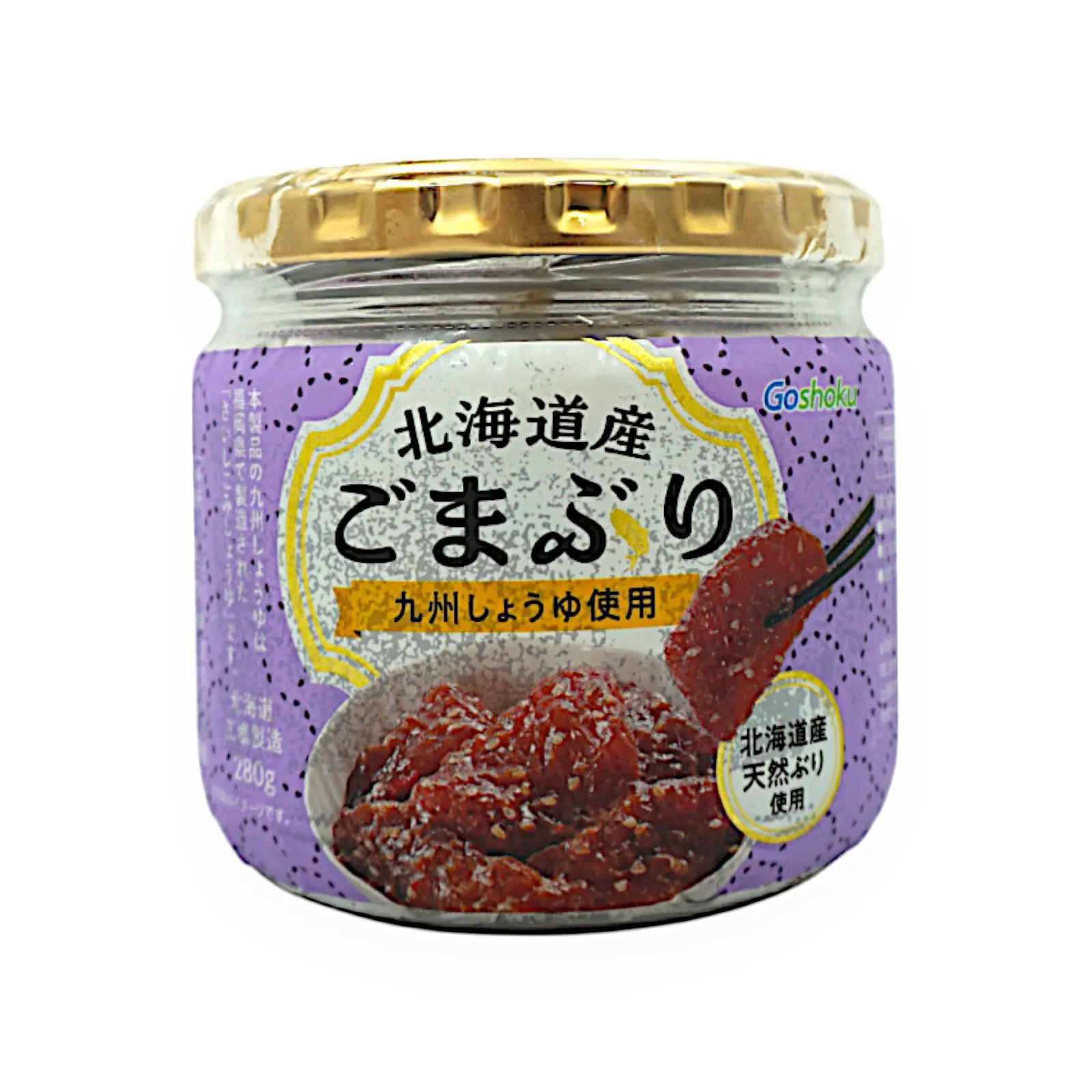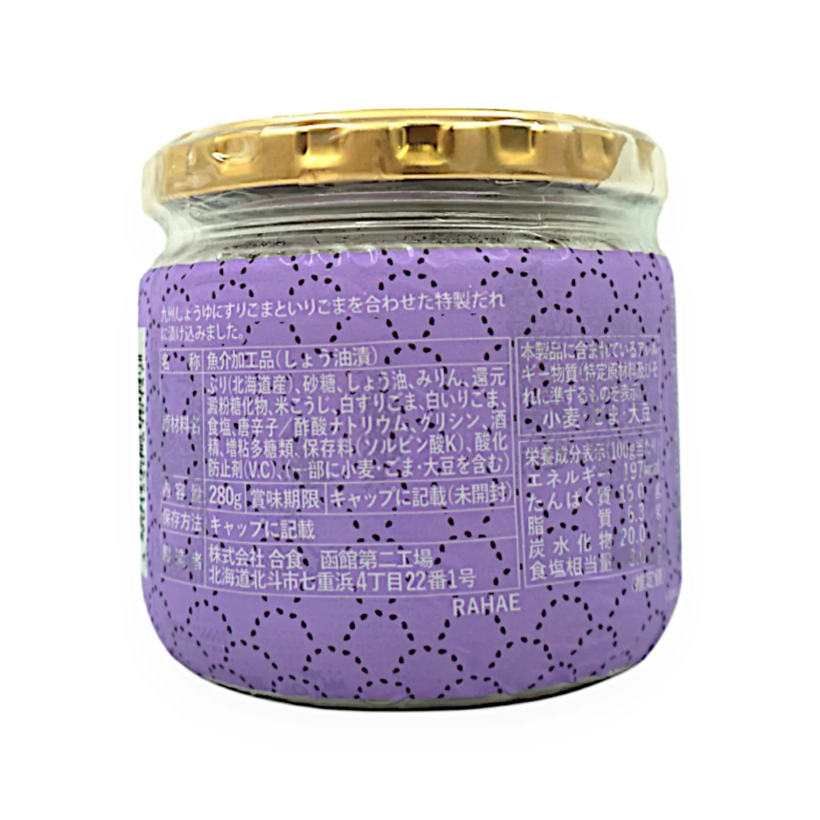ぶり(北海道産)、砂糖、しょう油、みりん、還元澱粉糖化物、米こうじ、白すりごま、白いりごま、食塩、唐辛子/酢酸ナトリウム、グリシン、酒精、増粘多糖類、保存料(ソルビン酸K)、酸化防止剤(V .C)、(一部に小麦・ごま・大豆を含む)