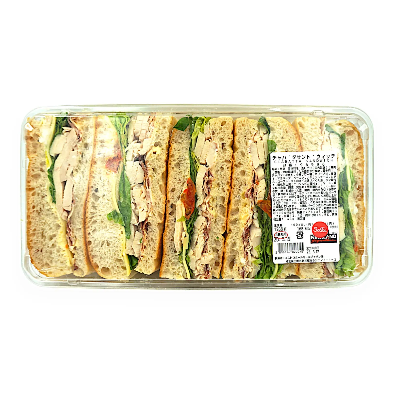 | 原材料名 | 蒸しどり(国内製造(鶏肉、食塩、発酵調味料、たん白加水分解物、香辛料)、チャバタ(小麦粉、小麦サワー種、オリーブ油、食塩)、マヨネーズ、ベーコン、 ナチュラルチーズ、レタス、ローストトマトのオイル漬け/くん液、リン酸Na、酸化防止剤(エリソルビン酸Na)、V.C、香辛料抽出物、酵素、発色剤(亜硝酸Na)、(一部に小麦・卵・乳成分・大豆・鶏肉・豚肉を含む) |