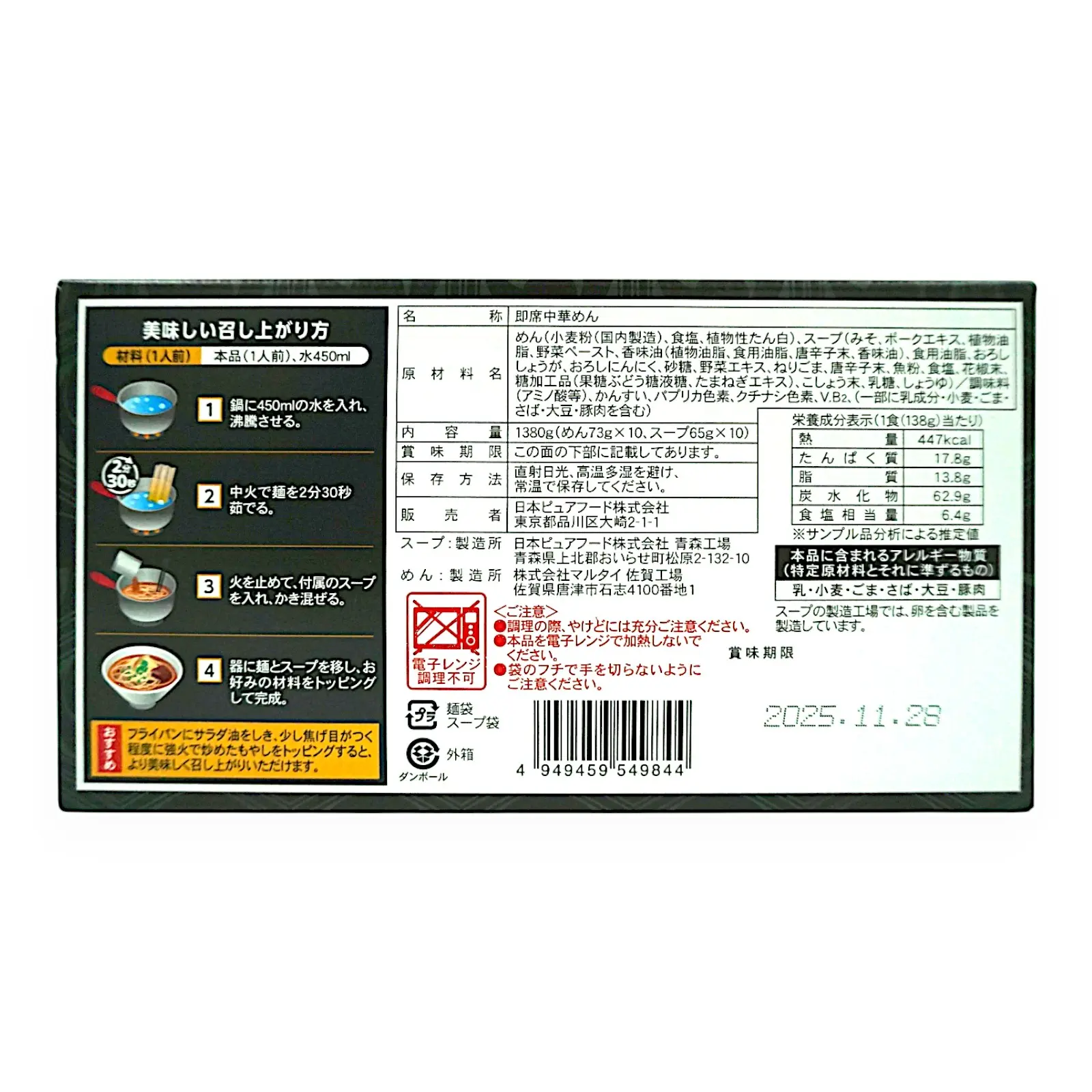 | 原材料名 | めん(小麦粉(国内製造)、食塩、植物性たん白)、スープ(みそ、ポークエキス、植物油脂、野菜ペースト、香味油(植物油脂、食用油脂、唐辛子末、香味油)、食用油脂、おろししょうが、おるしにんにく、砂糖、野菜エキス、 ねりごま、唐辛子末、魚粉、食塩、花椒末、糖加工品(果糖ぶどう糖液糖、たまねぎエキス)、こしょう末、乳糖、しょうゆ)/調味料(アミノ酸等)、かんすい、パプリカ色素、クチナシ色素、V.B2、(一部に乳成分・小麦・ごま・さば・大豆・豚肉を含む) |