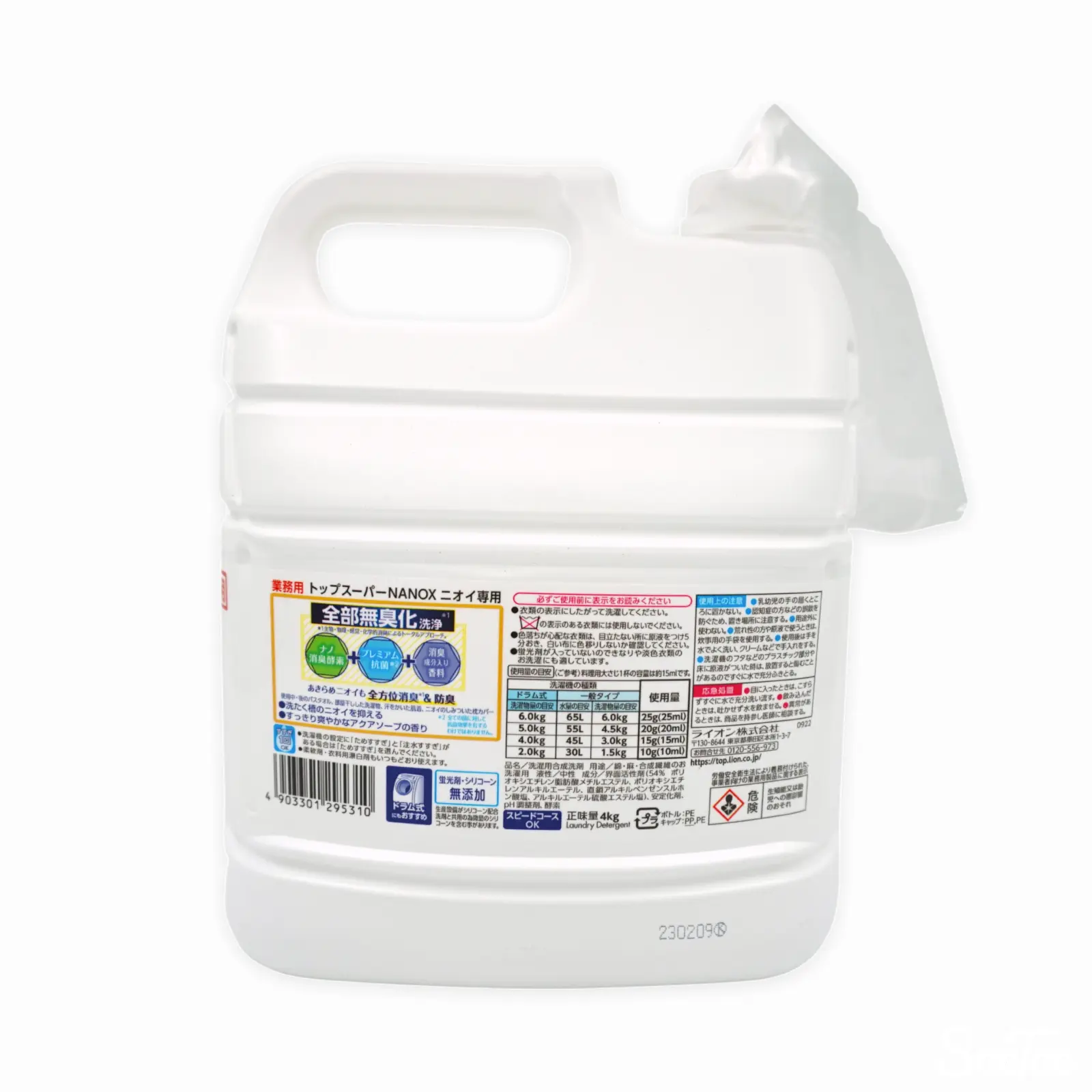 トップナノックス液体洗剤、ニオイ専用4kg入りボトルです。すでに衣類についている匂いを落とし、防臭効果もあります。