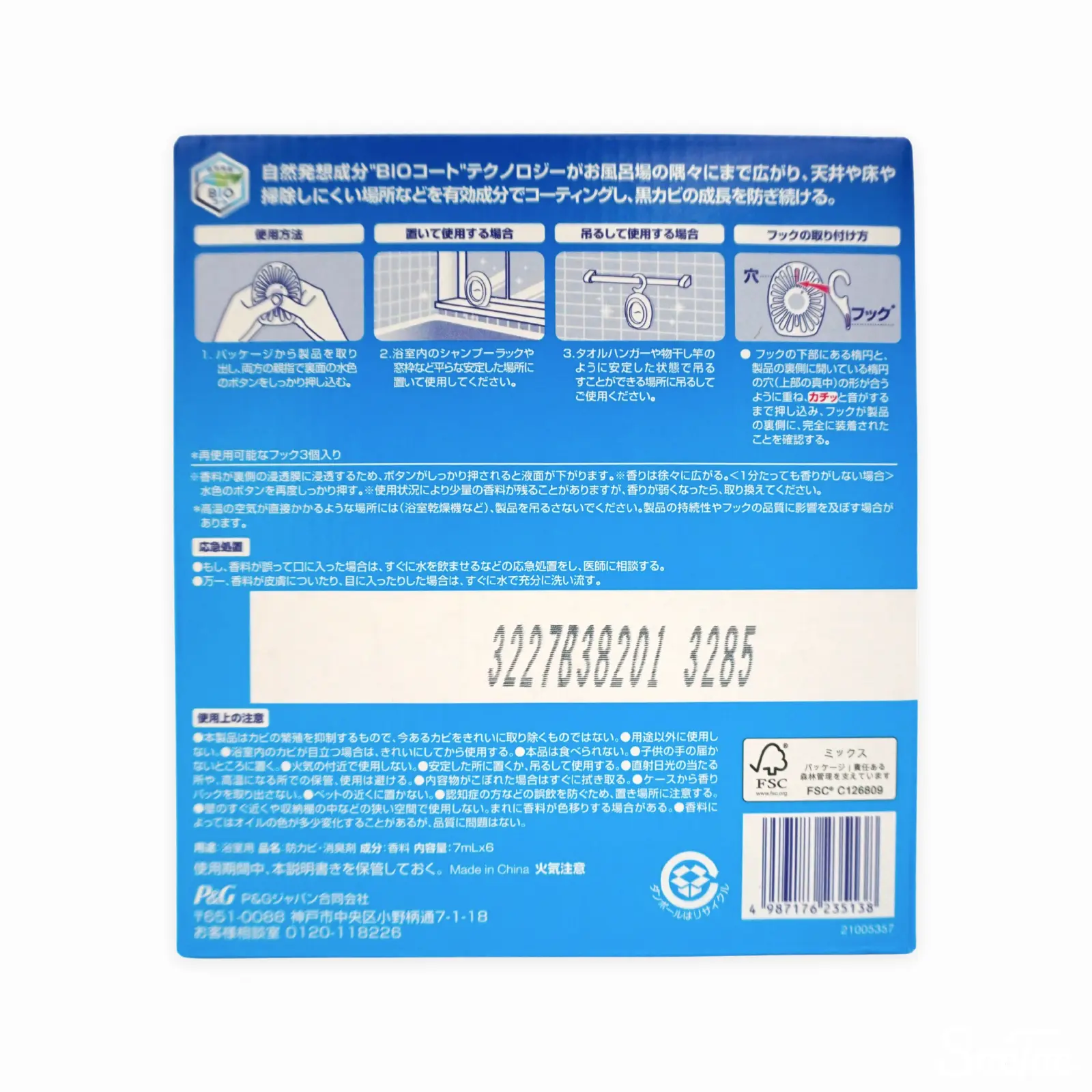 ファブリーズのお風呂用防カビ剤6個入りパックです。本体をそのまま置く、あるいはフック部分でタオル掛け等につるすだけでカビやぬめりの発生を防止します。1個で6週間効果が続きます。