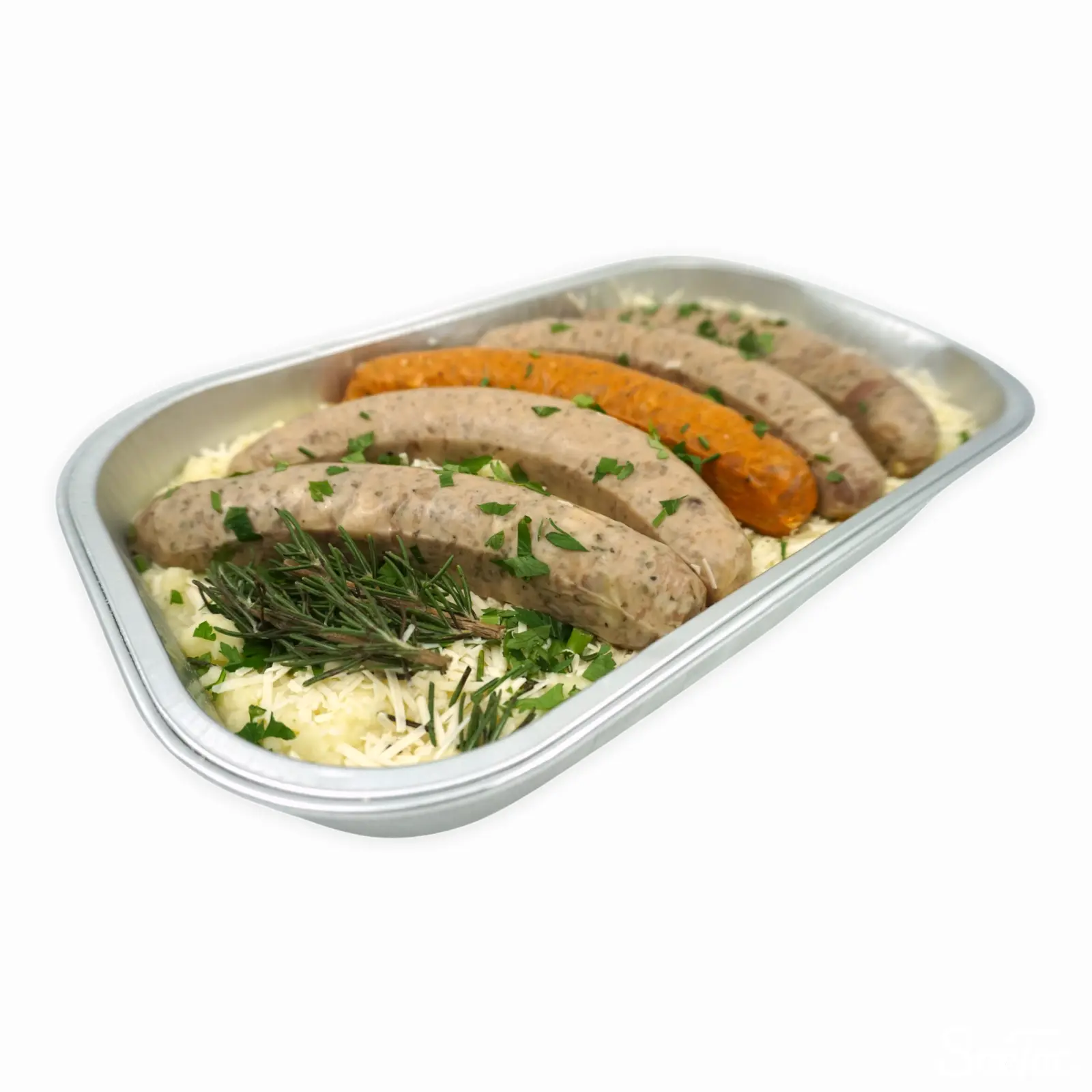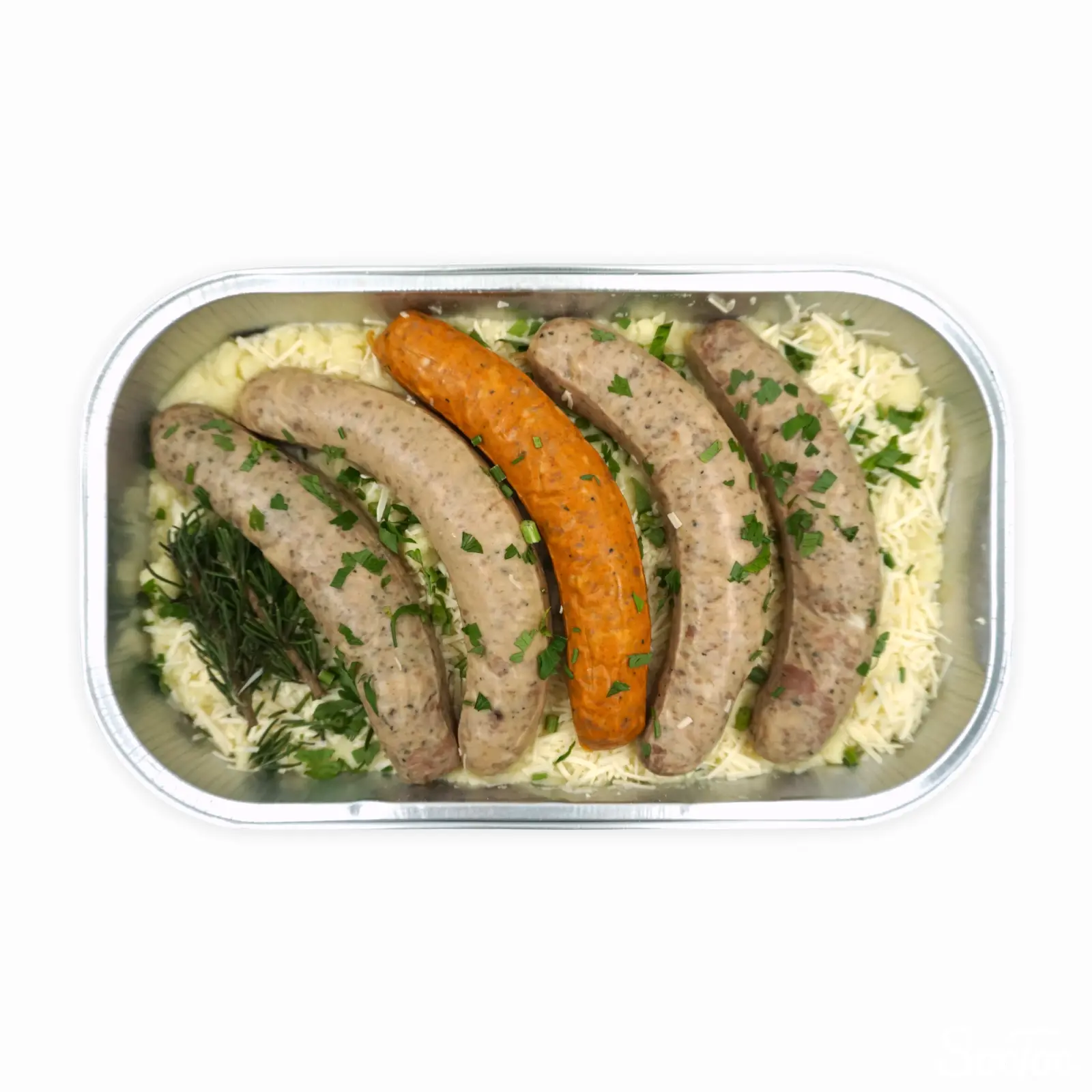 マッシュポテトとチーズの上に大きなソーセージが5本乗った豪快なデリカです。香りづけにローズマリーが使われています。オーブンで180度30分加熱調理して完成となります。