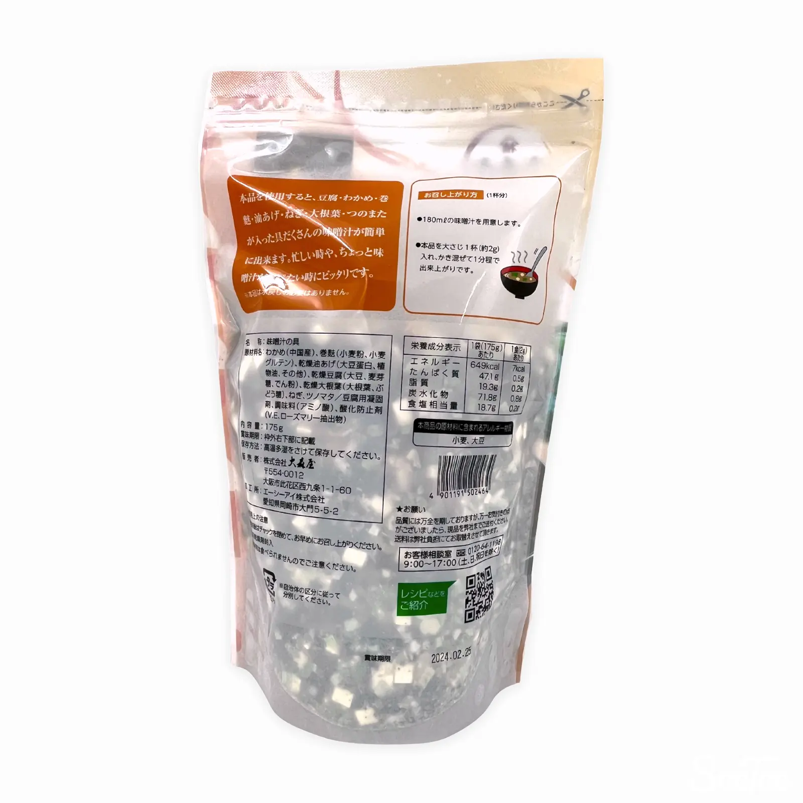 大森屋のフリーズドライのお味噌汁の具材パックです。豆腐、わかめ、巻麩、油揚げ、ねぎ、大根葉、つのまた(海藻)が入っており、175gは85杯分相当の量になります。