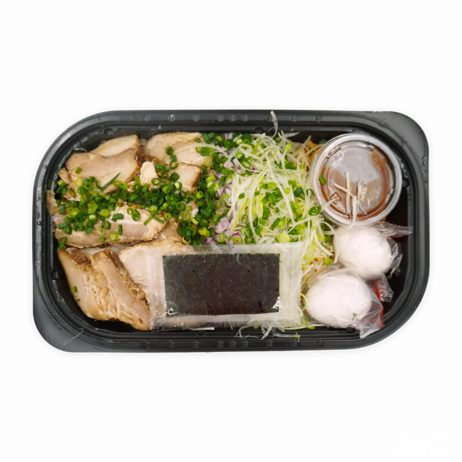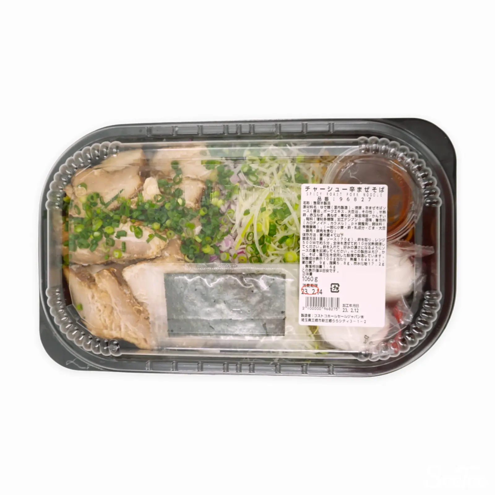 デリカコーナーにある調理済みのまぜそばです。分厚いチャーシュー、半熟卵、たっぷりの葱と茹で麺のセットになっています。タレは魚介出汁のソースがすでに和えられており、追加で旨辛のソースをまぜこみます。