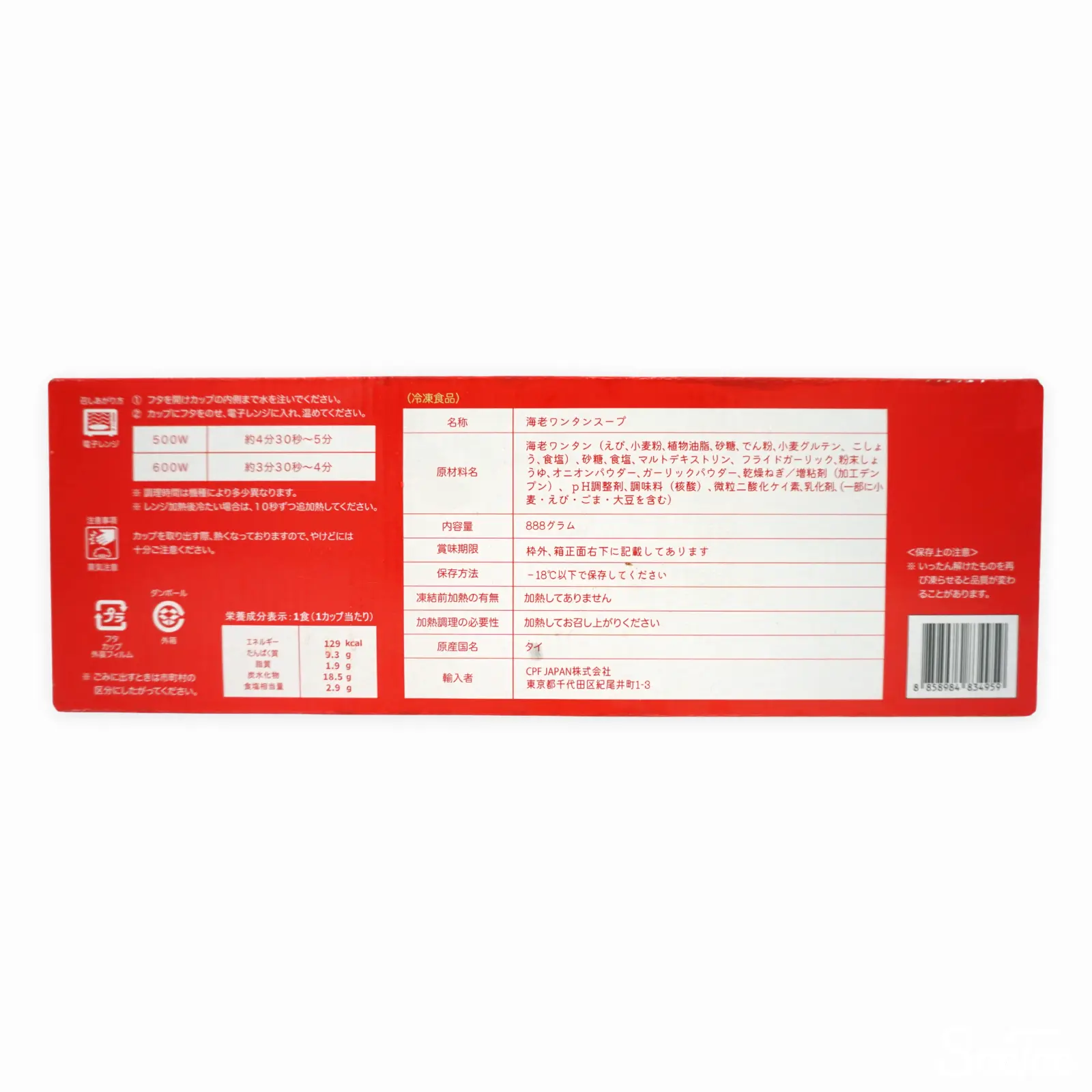 | 原材料名 | 海老ワンタン(えび、小麦粉、植物油脂、砂糖、でん粉、小麦グルテン、こしょう、食塩)、砂糖、食塩、マルトデキストリン、フライドガーリック、粉末しょうゆ、オニオンパウダー、ガーリックパウダー、乾燥ねぎ/増粘剤(加工デンプン)、pH調整剤、調味料(核酸)、微粒二酸化ケイ素、乳化剤、(一部に小麦・えび・ごま・大豆を含む) |