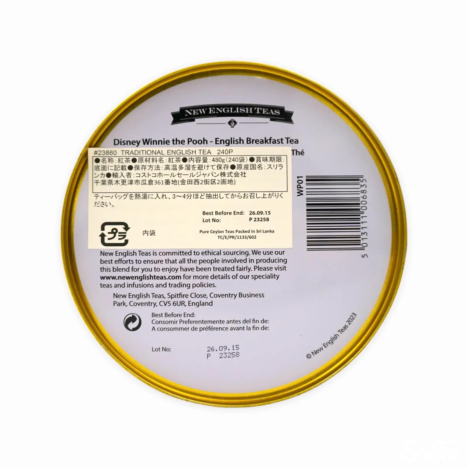 イギリスの紅茶ブランドNew English Teasの紅茶缶(くまのプーさんデザイン)です。ブレックファーストティーのティーバッグが240個入っています。