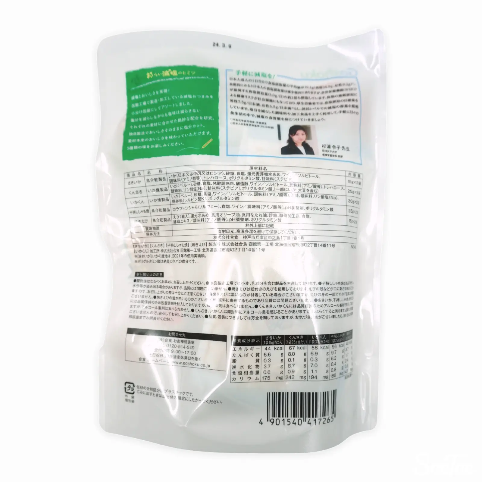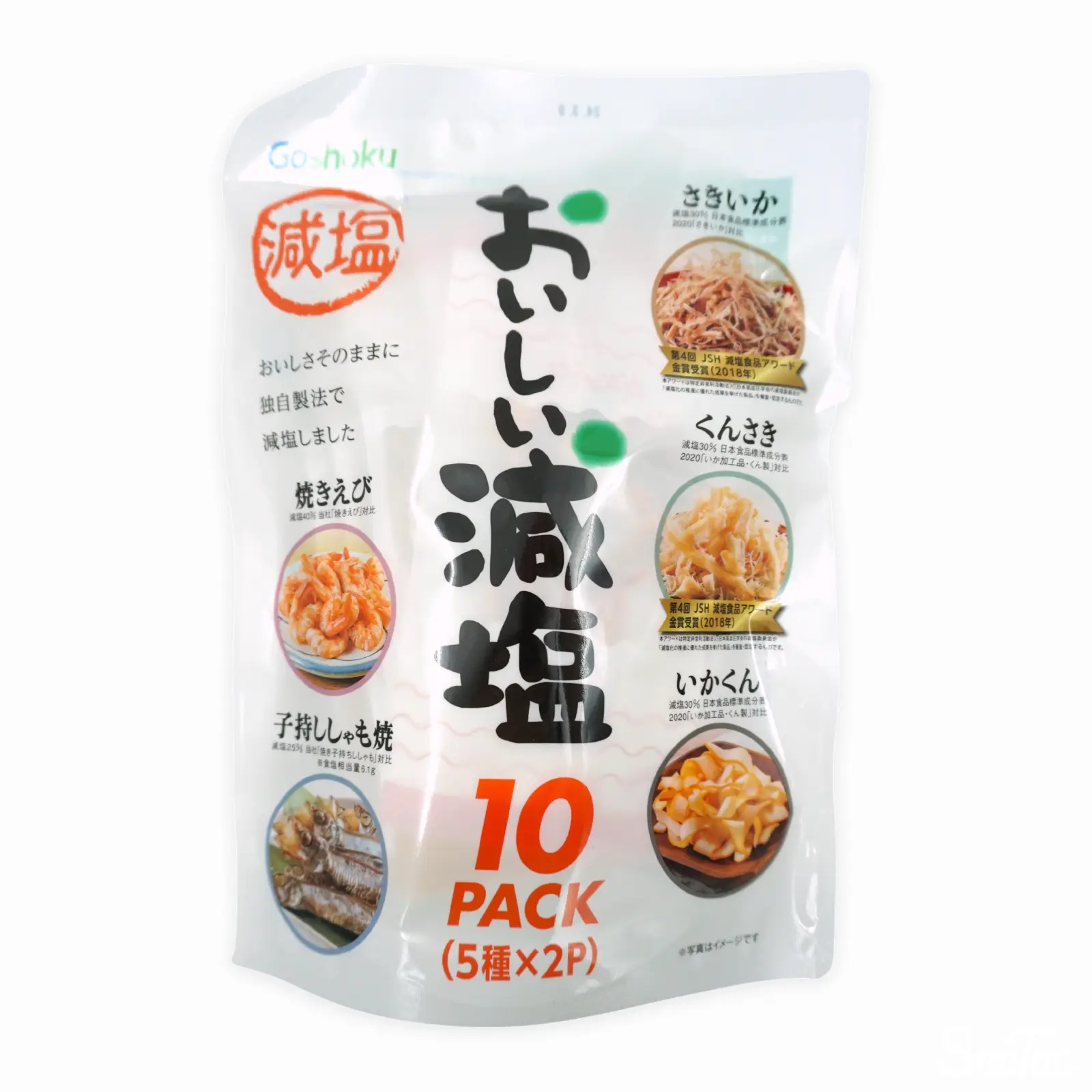 合食のおつまみアソートです。さきいか、くんさき、いかくん、焼きえび、子持ちししゃも焼がそれぞれ2袋ずつ入っています。減塩タイプで、一袋あたり食塩は1g前後に抑えられています。