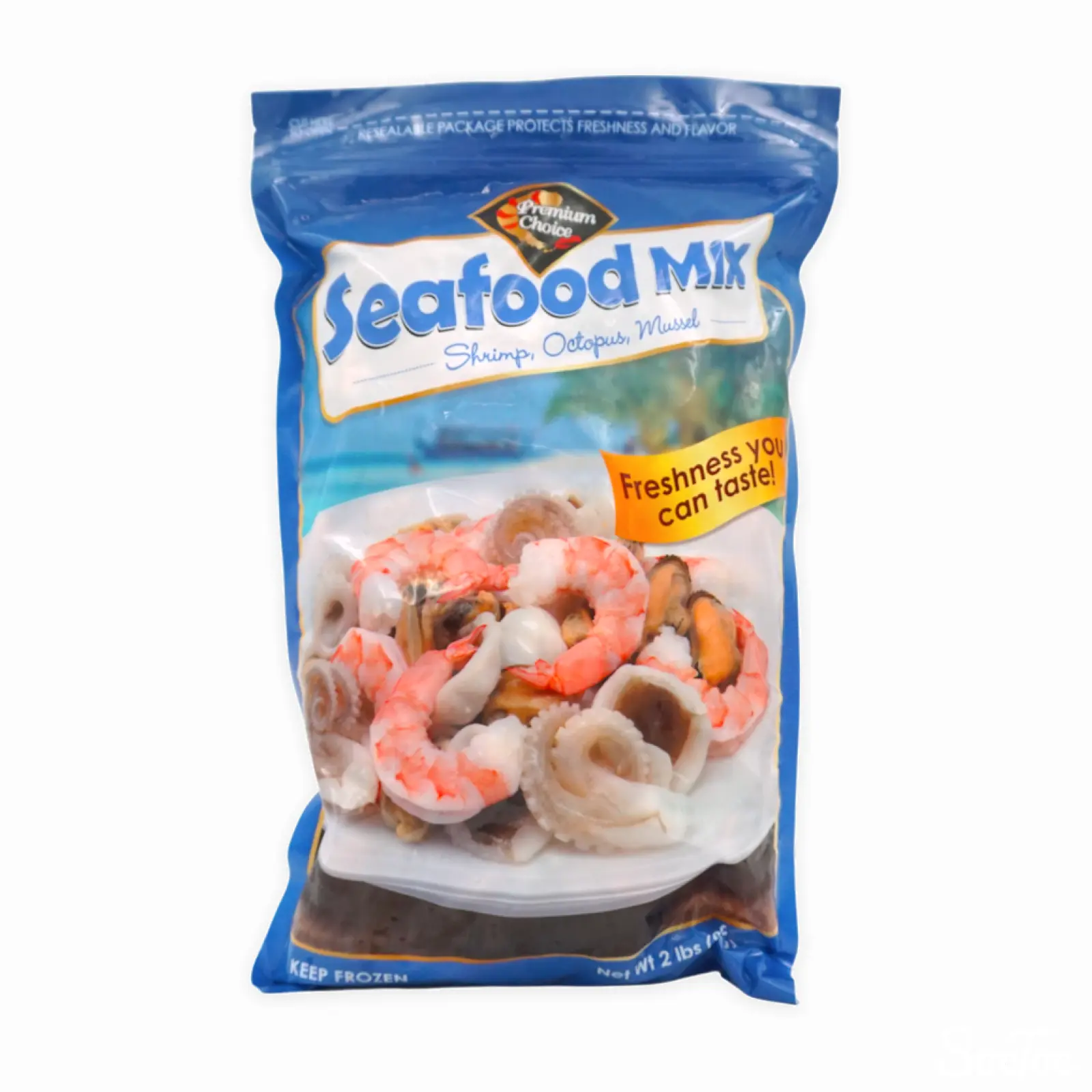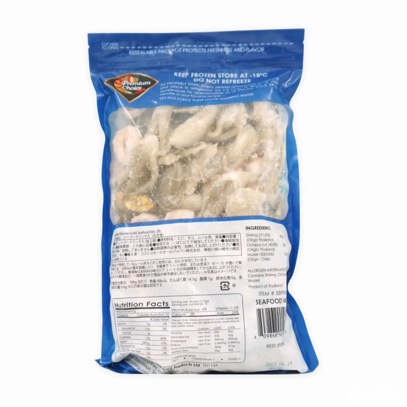 冷凍のエビ、タコ、ムール貝(殻なし)のミックス907gです。タイの商品で、日本ではあまり見かけない取り合わせのシーフードミックスとなっています。加熱してからお召し上がりください。