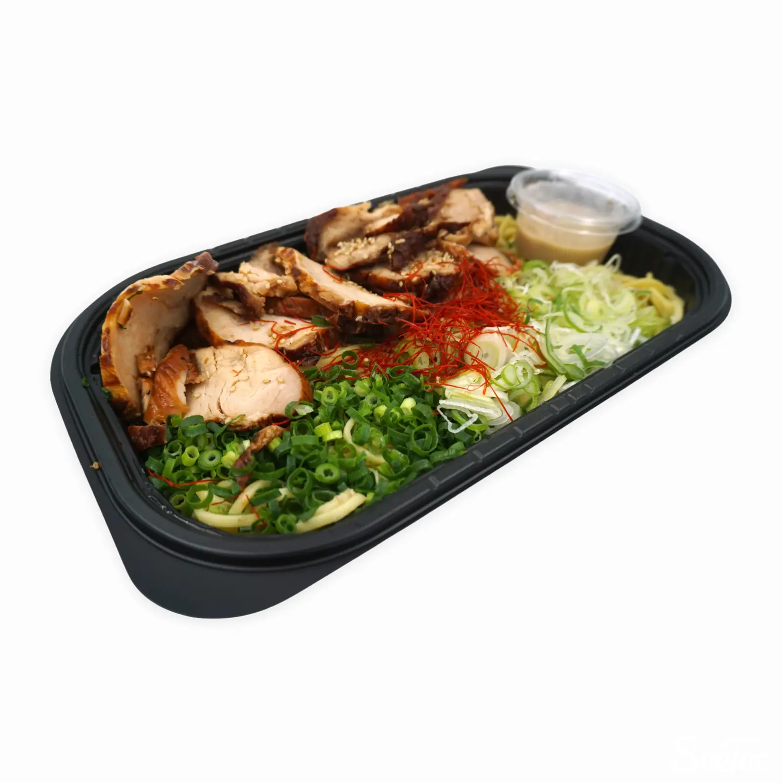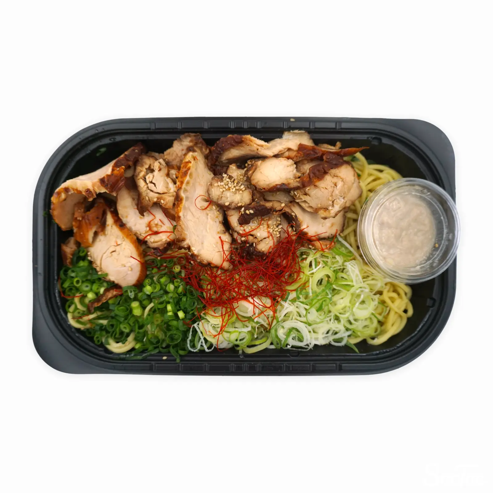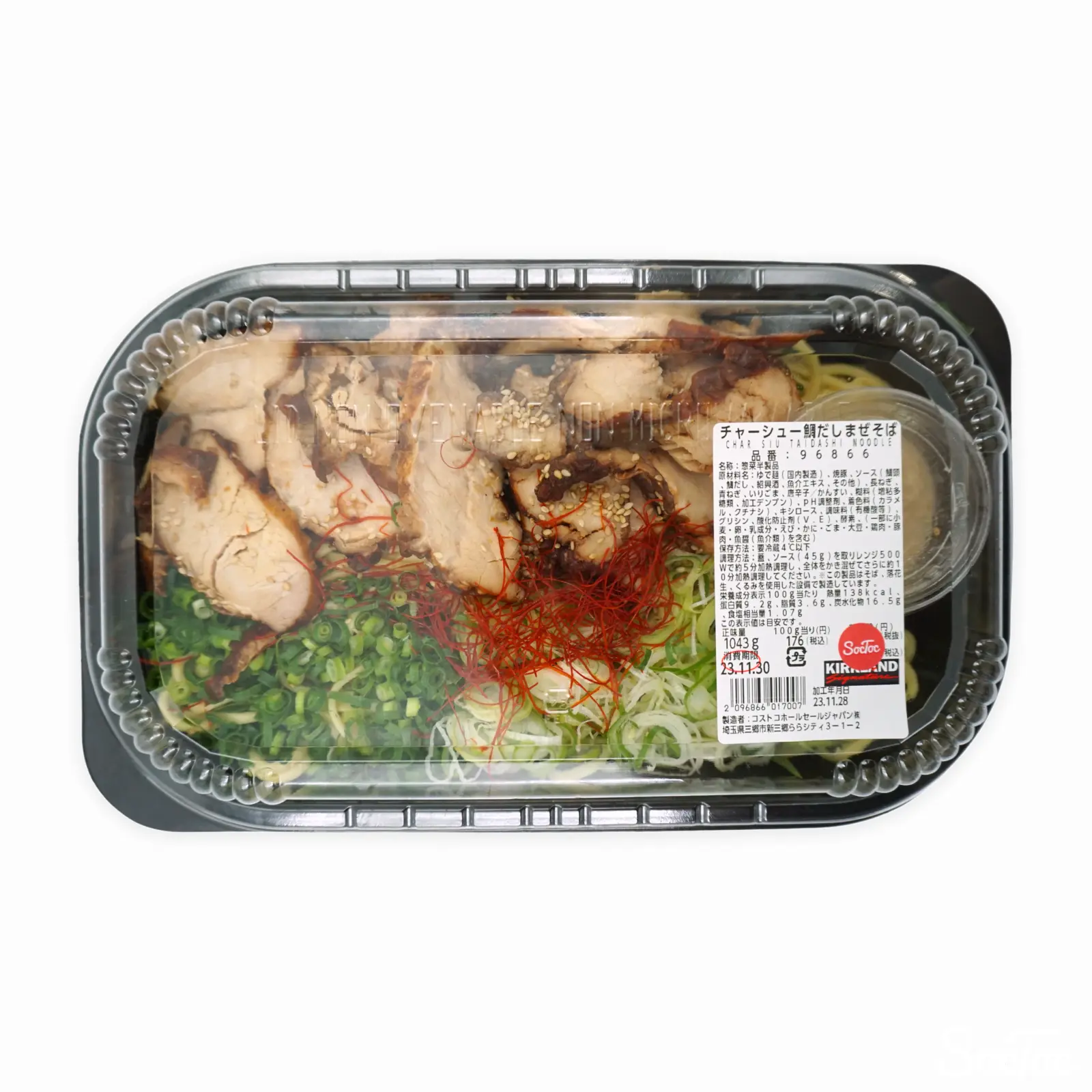 デリカコーナーにある調理済みのまぜそばです。たっぷりの小ネギ、長ネギに、厚切りのチャーシューと茹で麺のセットになっています。タイ出汁の入ったソースがついており、お好みでかけてお召し上がりください。