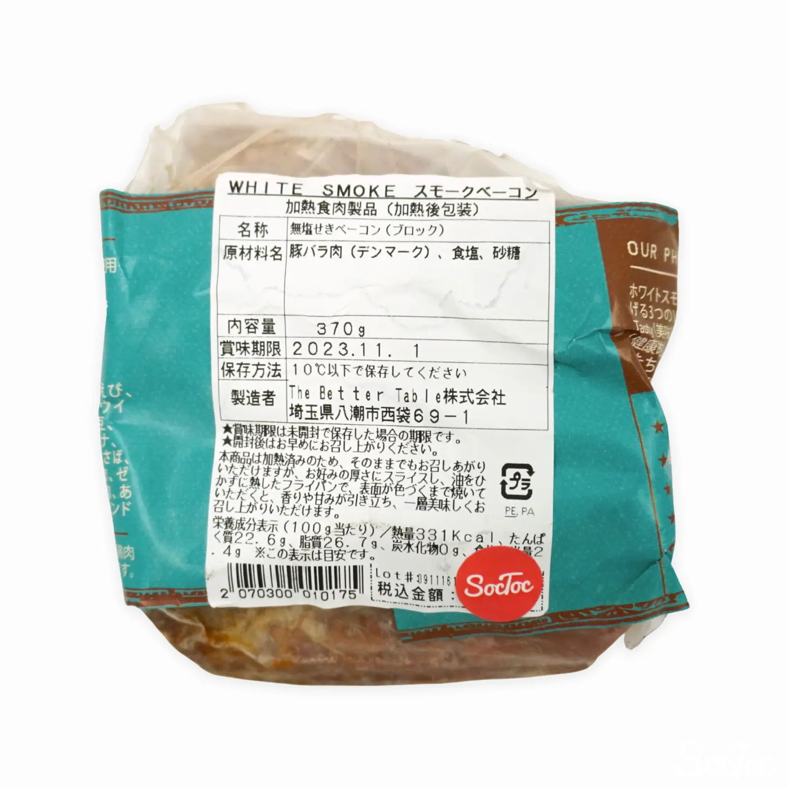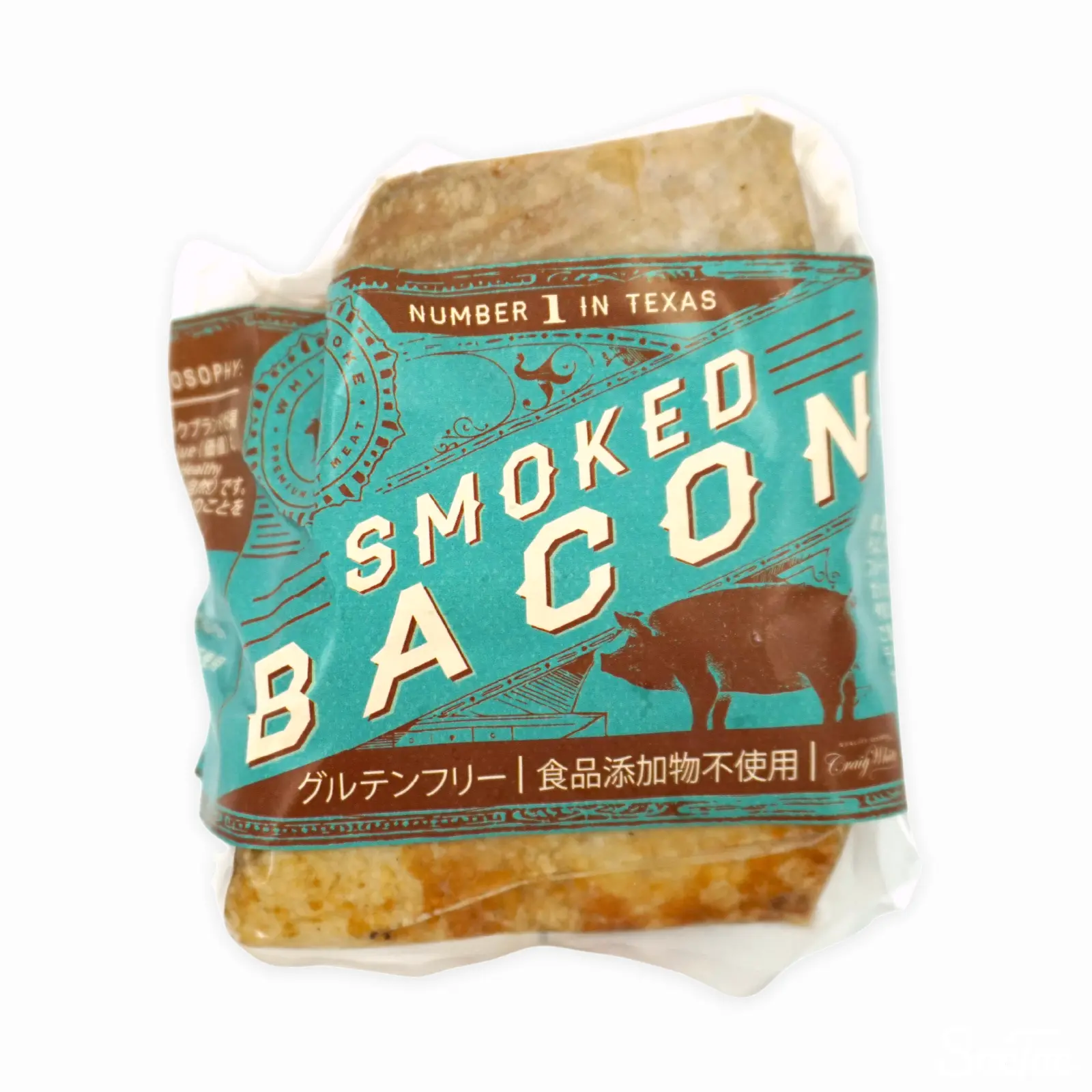 保存料、化学調味料のほか、発色剤等も不使用の完全無添加ベーコンです。ナラの木でスモークされているもので、加熱調理済みのため、そのままお召し上がりいただけます。