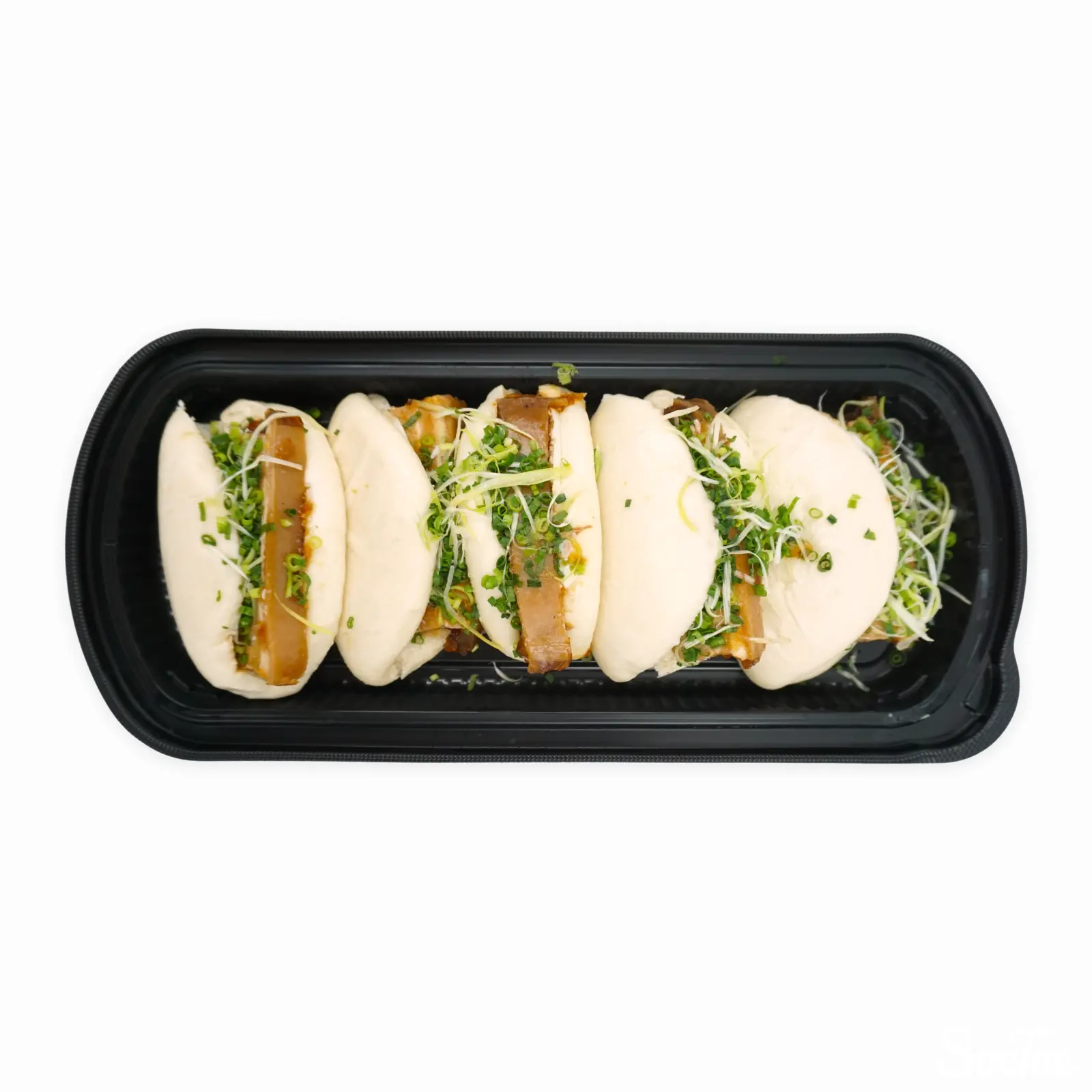 台湾の饅頭料理である割包(カーパオ)5切入りのパックです。分厚い豚角煮が中華まんの皮にサンドされ、ネギがトッピングされています。レンジ等で温めると一層おいしくお召し上がりいただけます。