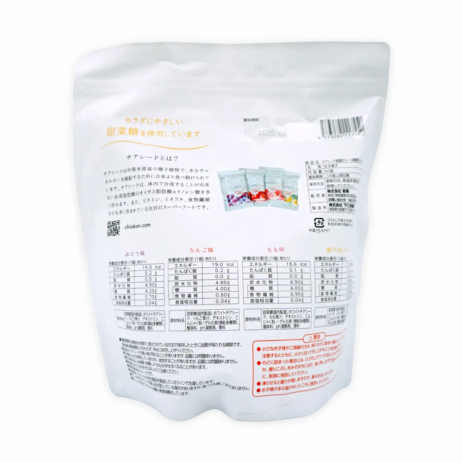 | 原材料名 | ぶどう味:甜菜糖(国内製造)、ホワイトチアシード、ぶどう果汁、デキストリン、こんにゃく粉/ゲル化剤(増粘多糖類)、酸味料、pH調整剤、香料 りんご味:甜菜糖(国内製造)、ホワイトチアシード、りんご果汁、デキストリン、こんにゃく粉/ゲル化剤(増粘多糖類)、酸味料、pH調整剤、香料 もも味:甜菜糖(国内製造)、ホワイトチアシード、もも果汁、デキストリン、こんにゃく粉/ゲル化剤(増粘多糖類)、酸味料、pH調整剤、香料 瀬戸内レモン味:甜菜糖(国内製造)、ホワイトチアシード、レモン果汁、デキストリン、こんにゃく粉/酸味料、pH調整剤、ゲル化剤(増粘多糖類)、香料 |