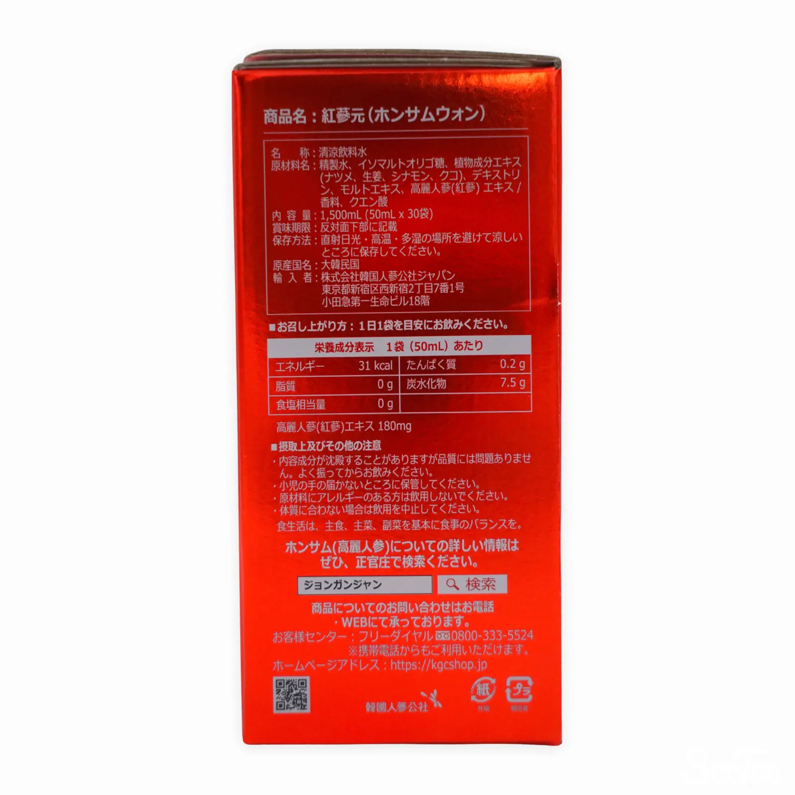 精製水、イソマルトオリゴ糖、植物成分エキス(ナツメ、生姜、シナモン、クコ)、デキストリン、モルトエキス、高麗人蔘(紅蔘)エキス/香料、クエン酸