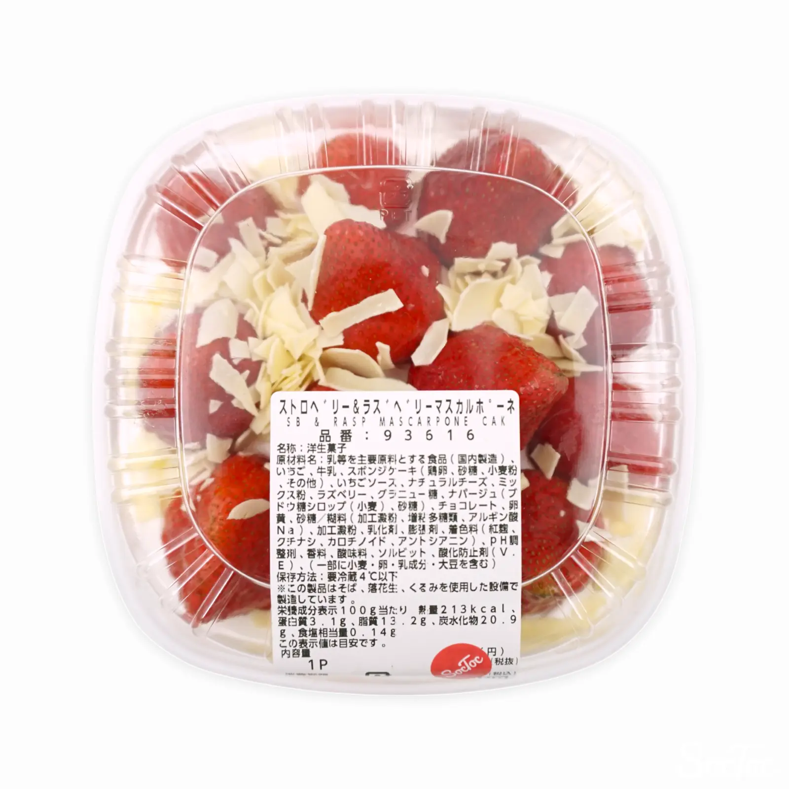 正方形のパックに入ったストロベリーケーキです。上にはナパージュのかかった大きなストロベリー、クリームは生クリーム、カスタードに加えラズベリーマスカルポーネクリームの3種類がスポンジにサンドされています。