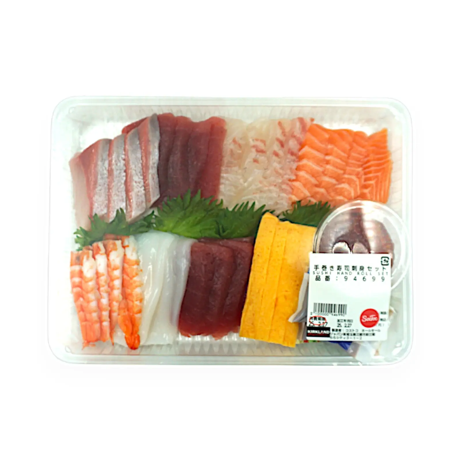 ぶり・まぐろ・タイ・サーモン・ボイルえび・いか・たまご・いくらが手巻き寿司用にカットされた刺身セットです。※本商品は消費期限が当日のため、午後の配送でのみお届けいたします。