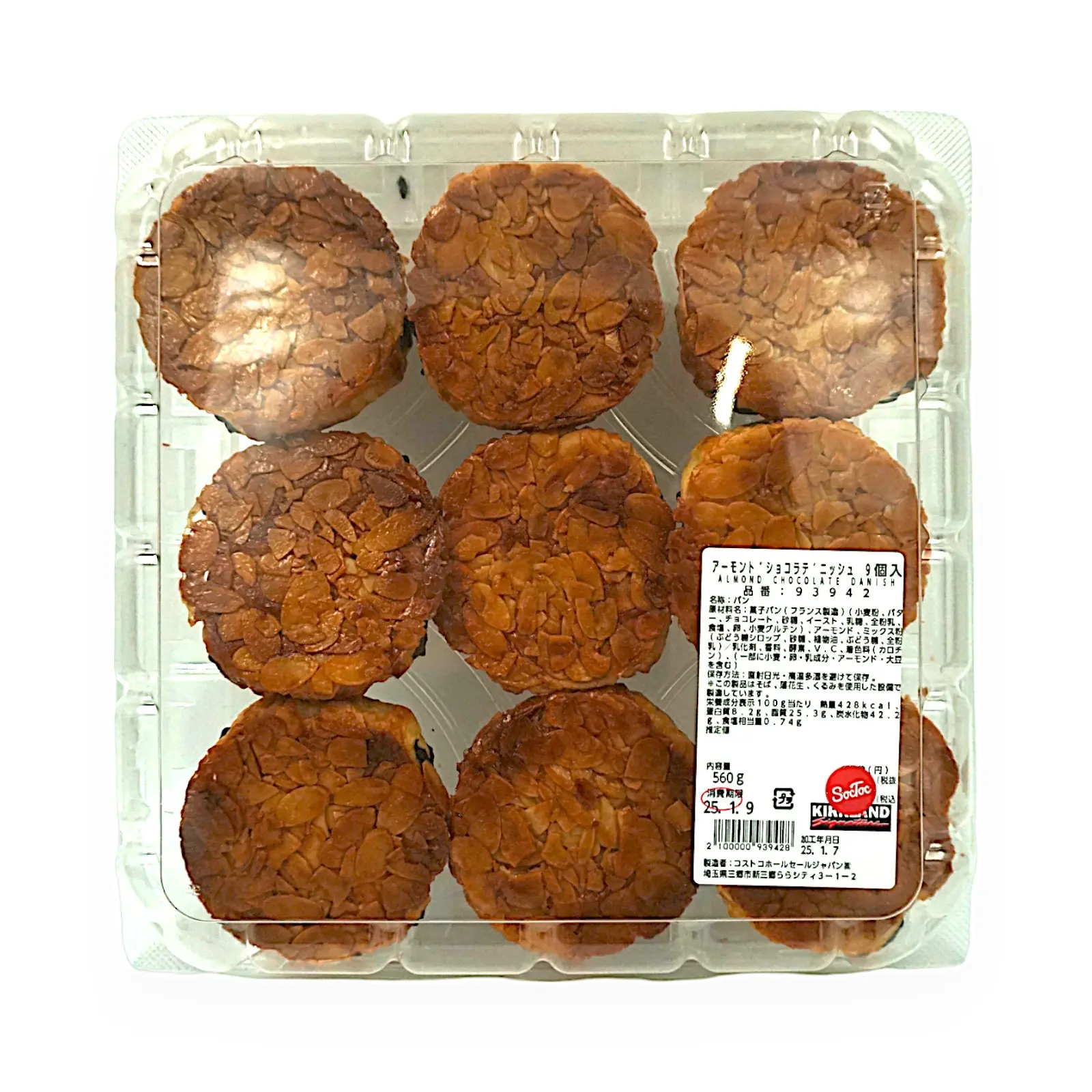 菓子パン(フランス製造)(小麦粉、バター・チョコレート、砂糖、イースト、乳糖、全粉乳、、食塩、卵、小麦グルテン)、アーモンド、ミックス粉(ぶどう糖シロップ、砂糖、植物油、ぶどう糖、全粉乳)/乳化剤、香料、酵素、V.C、着色料(カロチン)、(一部に小麦・卵・乳成分・アーモンド・大豆を含む)