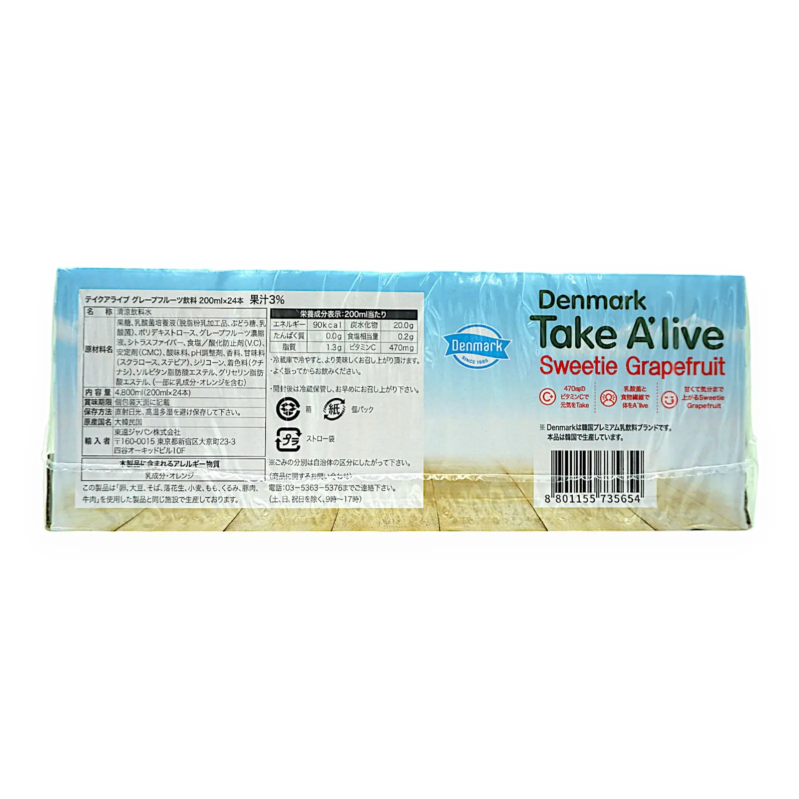 | 原材料名 | 果糖、乳酸菌培養液(脱脂粉乳加工品、ぶどう糖、乳酸菌)、ポリデキストロース、グレープフルーツ濃縮液、シトラスファイバー、食塩/酸化防止剤(V.C)、安定剤(CMC)、酸味料、pH調整剤、香料、甘味料(スクラロース、ステビア)、シリコーン、着色料(クチナシ)、ソルビタン脂肪酸エステル、グリセリン脂肪酸エステル、(一部に乳成分・オレンジを含む) |