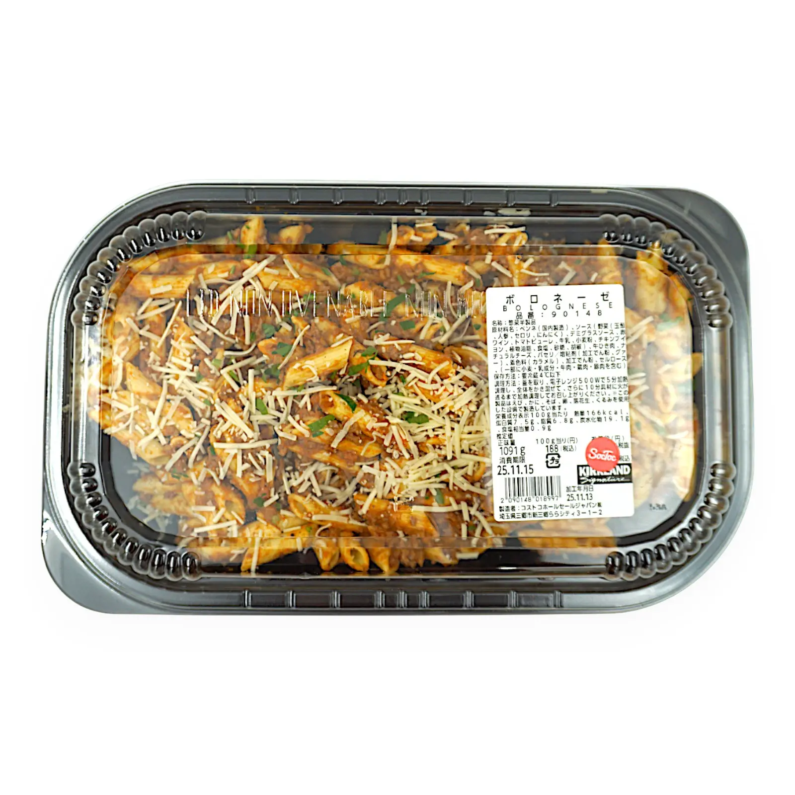 ペンネ(国内製造)、ソース(野菜(玉葱、人参、セロリ、にんにく)、デミグラスソース、赤ワイン、トマトピューレ、牛乳、小麦粉、チキンブイヨン、植物油脂、食塩、砂糖、胡椒)、牛ひき肉、ナチュラルチーズ、パセリ/増粘剤(加工でん粉、グァー)、着色料(カラメル)、加工でん粉、セルロース、(一部に小麦・乳成分・牛肉・鶏肉・豚肉を含む)