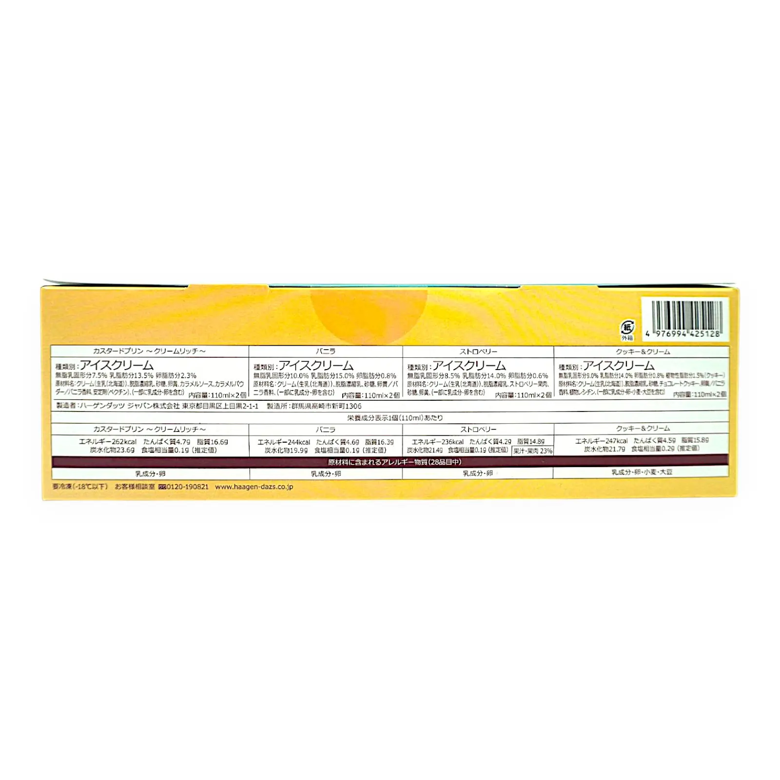 | 栄養成分表示 | 【カスタードプリン】エネルギー262kcal、たんぱく質4.7g 、脂質16.6g、炭水化物23.6g、食塩相当量0.1g 【バニラ】エネルギー244kcal、たんぱく質4.6g 、脂質16.3g、炭水化物19.9g、食塩相当量0.1g 【ストロベリー】エネルギー236kcal、たんぱく質4.2g 、脂質14.8g、炭水化物21.4g、食塩相当量0.1g 【クッキー&クリーム】エネルギー247kcal、たんぱく質4.5g 、脂質15.8g、炭水化物21.7g、食塩相当量0.2g |