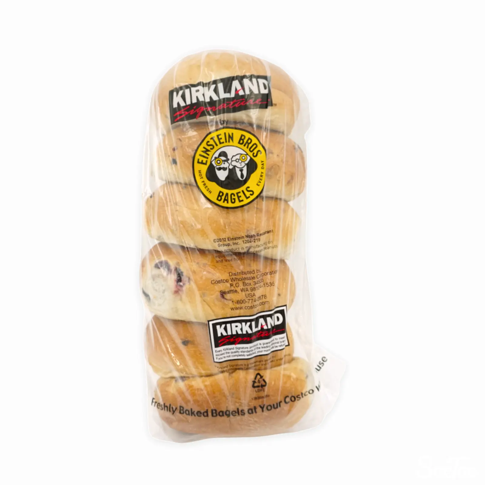 コストコのベーグルシリーズ、ブルーベリーフレーバーです。一袋に6個のベーグルが詰められています。大粒のブルーベリーのほか、クランベリーも入っています。チーズなどを添えてもいっそうおいしくお召し上がりいただけます。