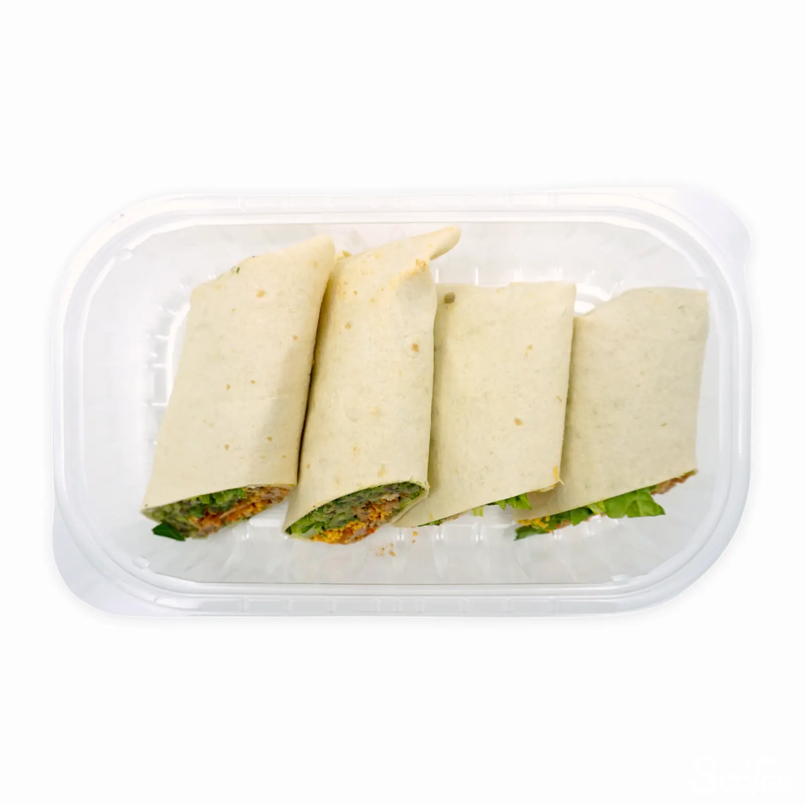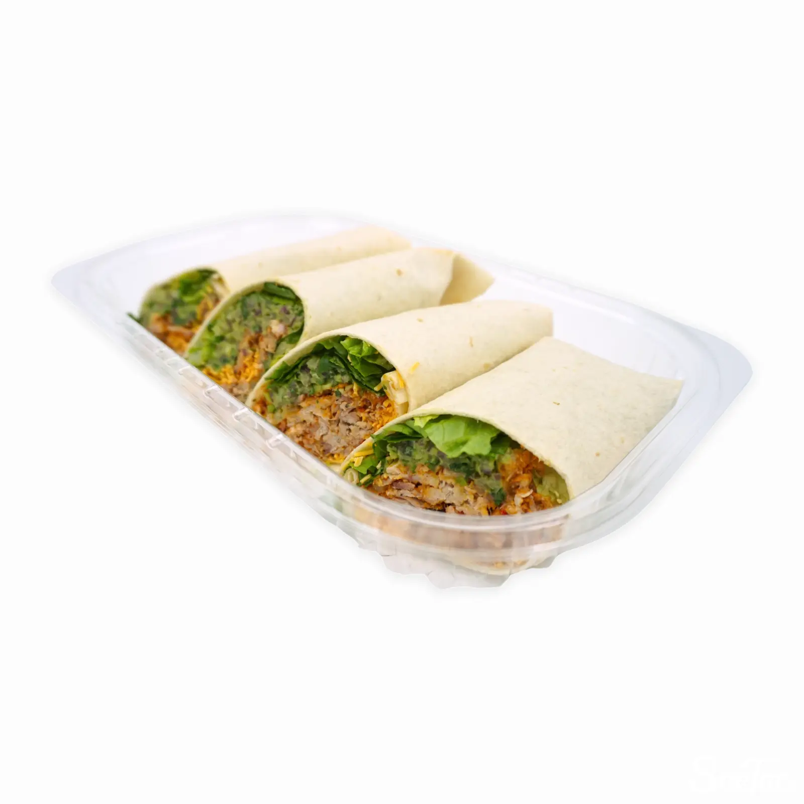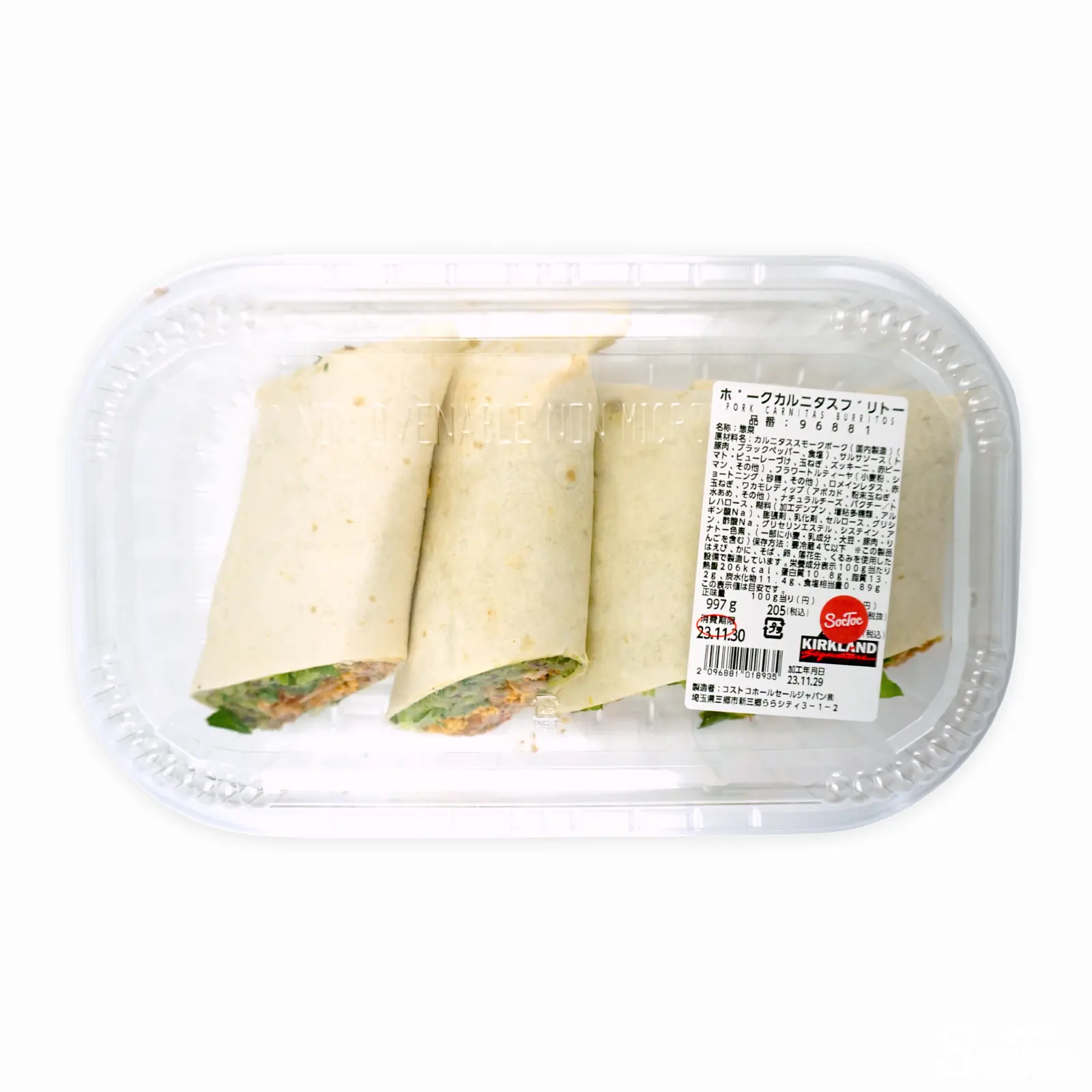 ポークカルニタス(メキシコ風豚肉のほろほろ煮)を使ったブリトー4切れのパックです。サルサソースとワカモレソースにあえられたスモークポークに、ズッキーニや赤ピーマンなどの野菜がたっぷり入っています。