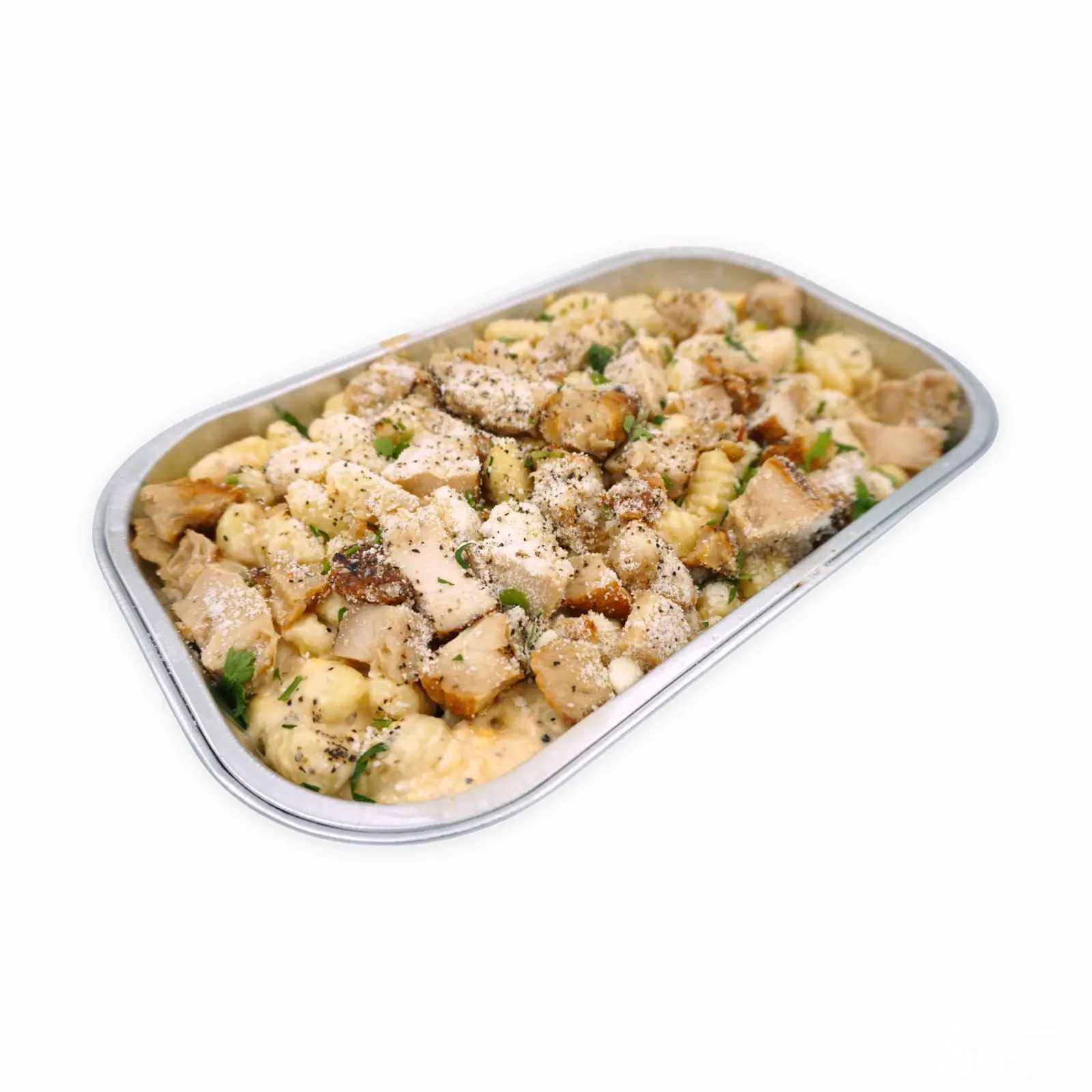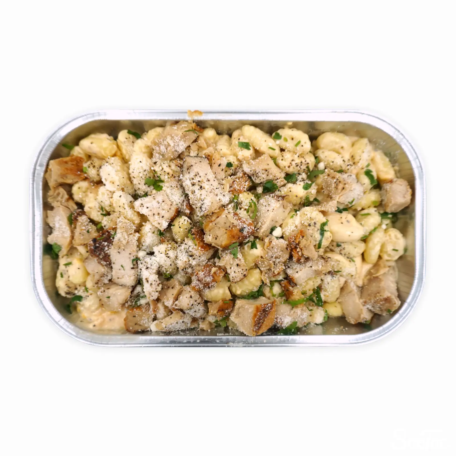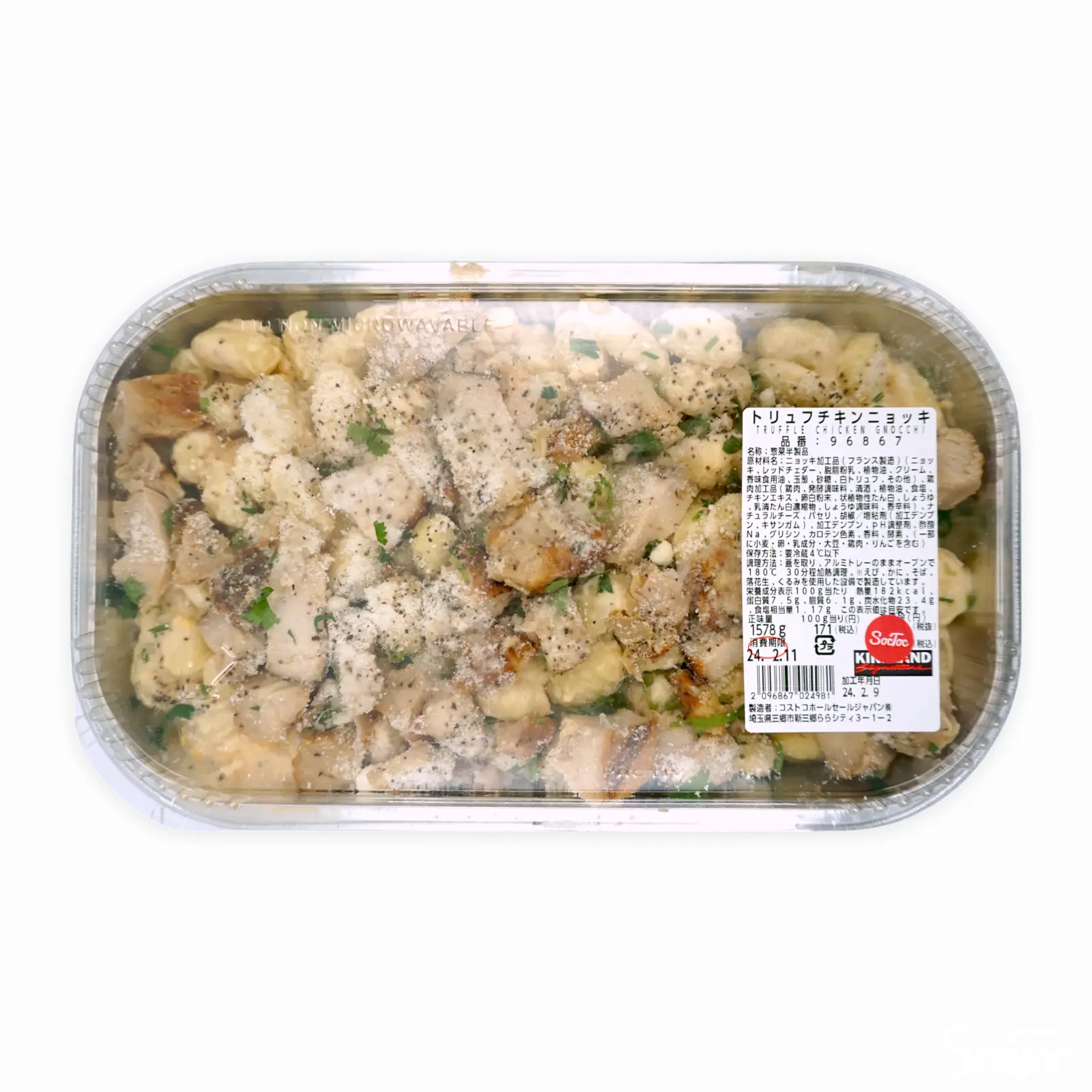 白トリュフが使われたチキンのニョッキです。180度のオーブンで30分加熱して完成となります。大きめにカットされたたくさんのチキンとパセリがのったニョッキで、トリュフ入りクリームソースが和えられています。