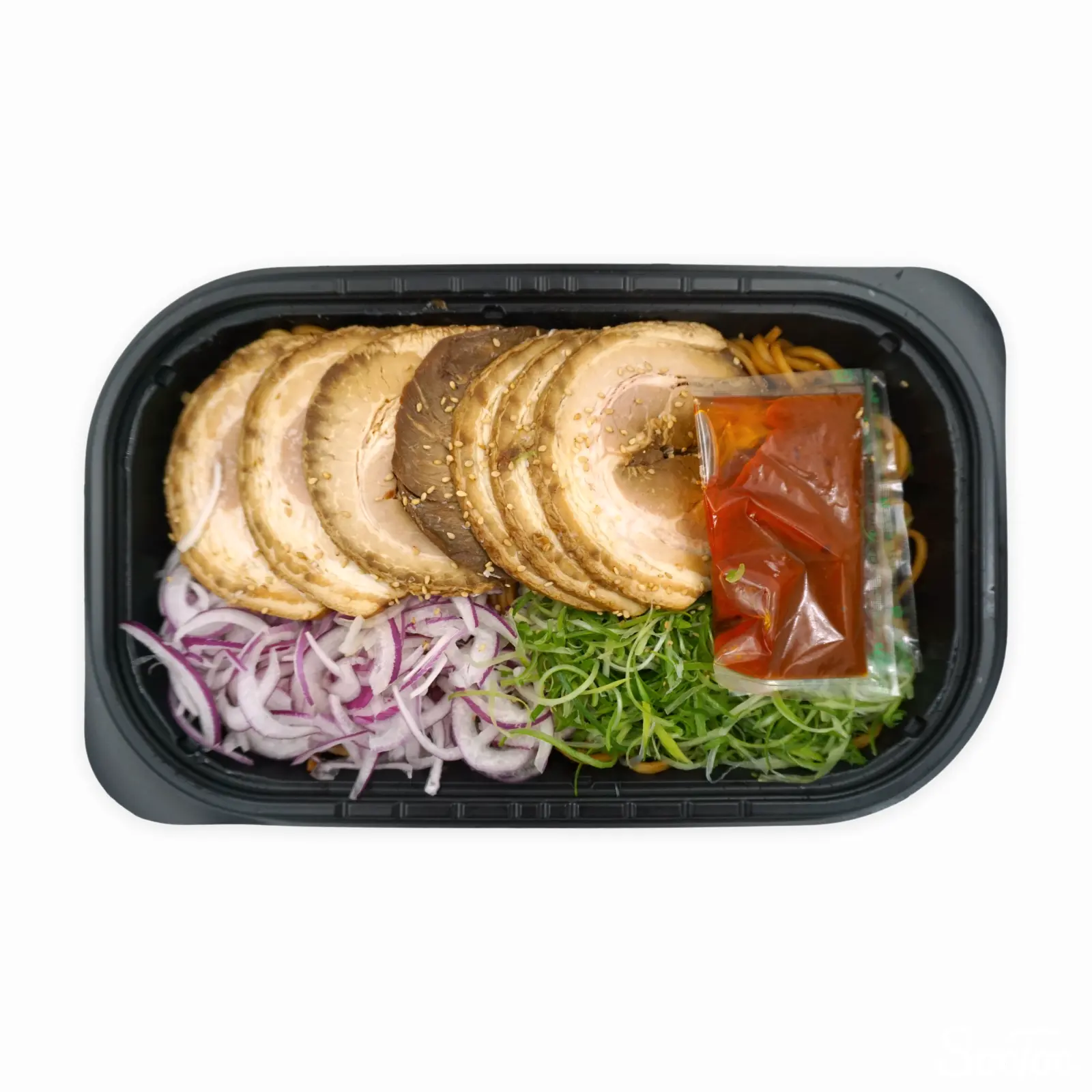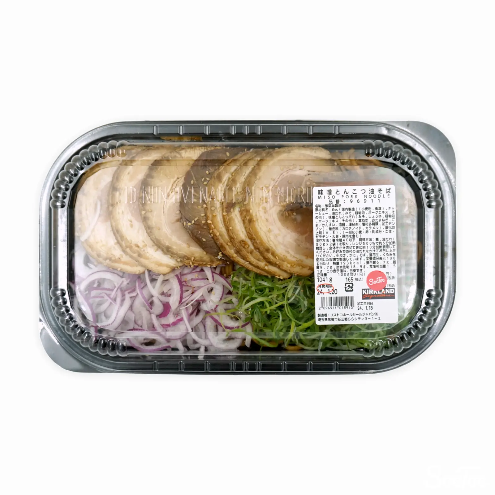 | 原材料名 | めん(国内製造)(小麦粉、食塩)、チャーシュー、油だれ(みそ、植物油、ポークエキス、その他)、味噌とんこつだれ(みそ、しょうゆ、植物油、ポークエキス、その他)、葉ねぎ、赤たまねぎ、ごま/かんすい、酒精、増粘剤(増粘多糖類、加工デンプン)、着色料(カロチノイド、カラメル)、酸化防止剤(VE)、(一部に小麦・卵・乳成分・ごまゼラチン大豆・豚肉を含む) ※えび、かに、そば、落花生、くるみを使用した設備で製造しています。 |