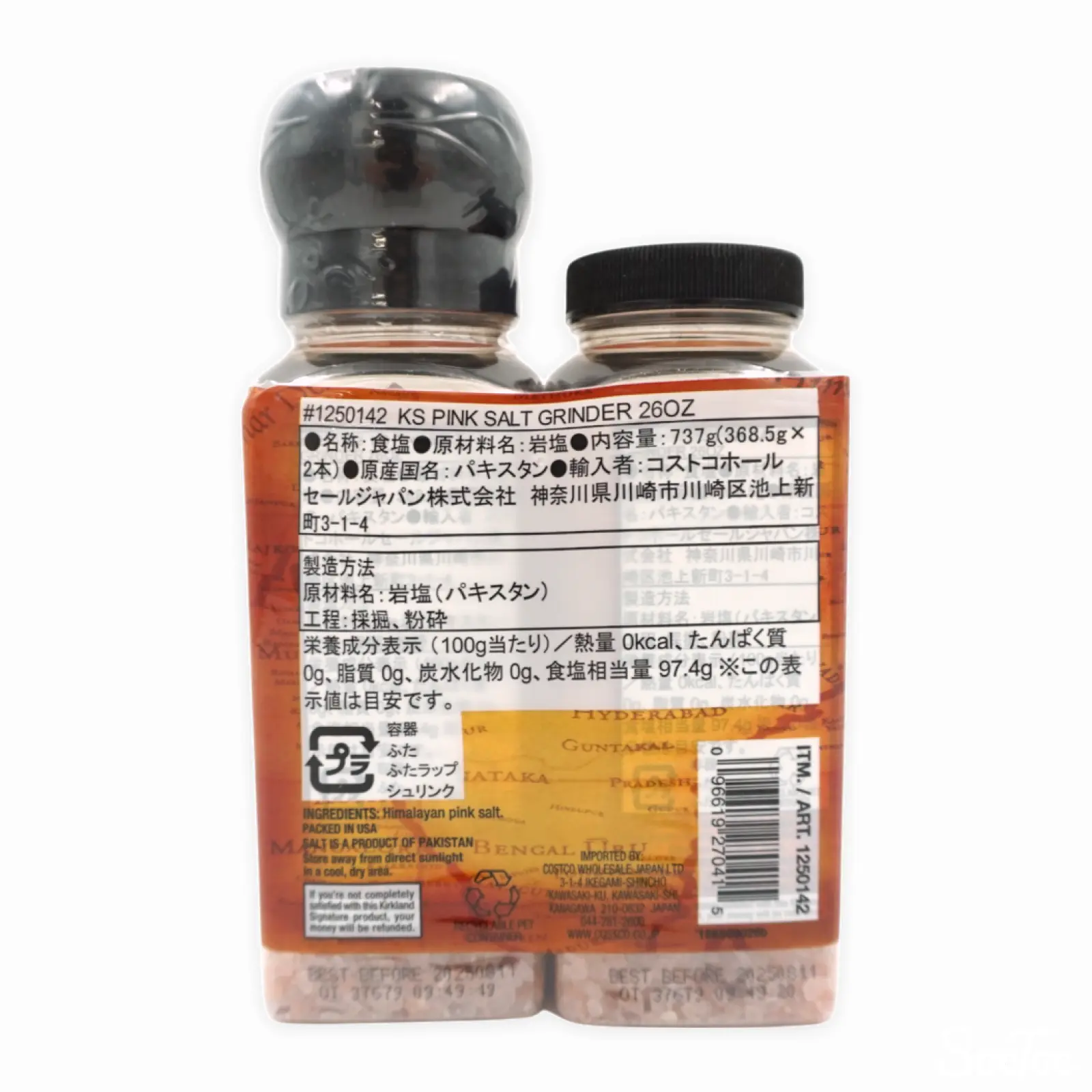 コストコのプライベートブランドである KIRKLAND SIGNATURE のグラインダー付き岩塩2本のセットです。ヒマラヤのピンク岩塩368.5gが粗い粒状で入っています。グラインダーは片方の瓶に取り付けられているため、2本目の瓶をご利用になる際はグラインダーを付け替えてご利用ください。