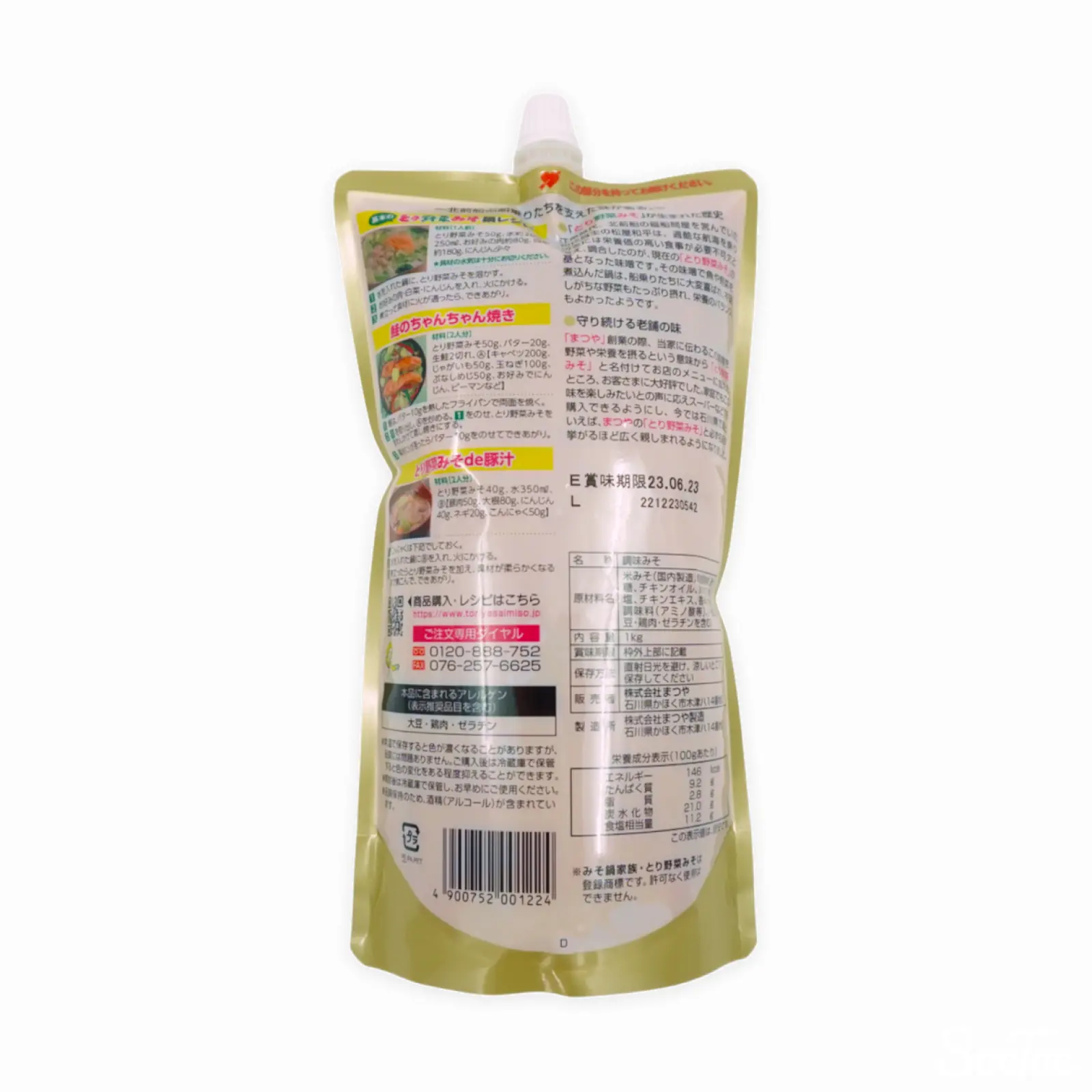 石川県まつやより、味噌調味料のとり野菜みそ1kgのパックです。野菜に大変よく合い、鍋のほか各種味噌の汁物にお使いいただけます。