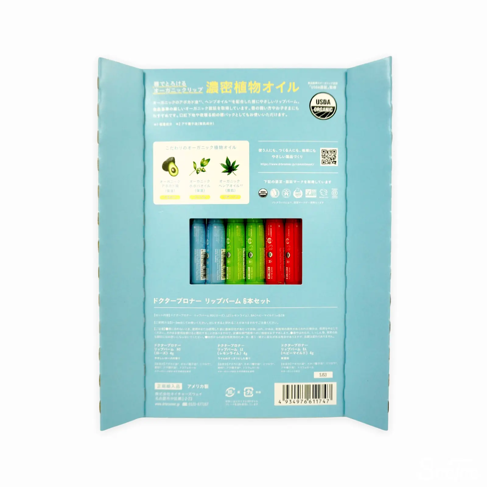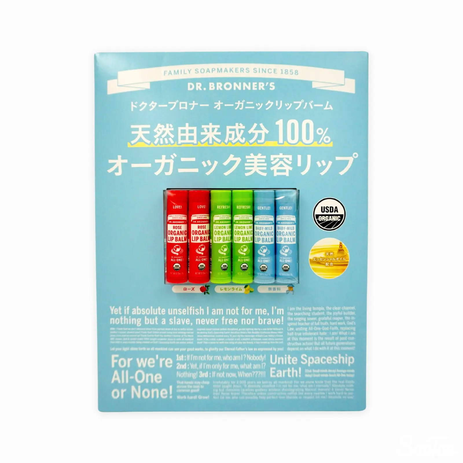 ドクターブロナーよりオーガニック素材のリップバーム6本のセットです。ローズ、レモンライム、ベビーマイルド(無香料)の3種類が入っています。乾燥する季節に備えていかがでしょうか。