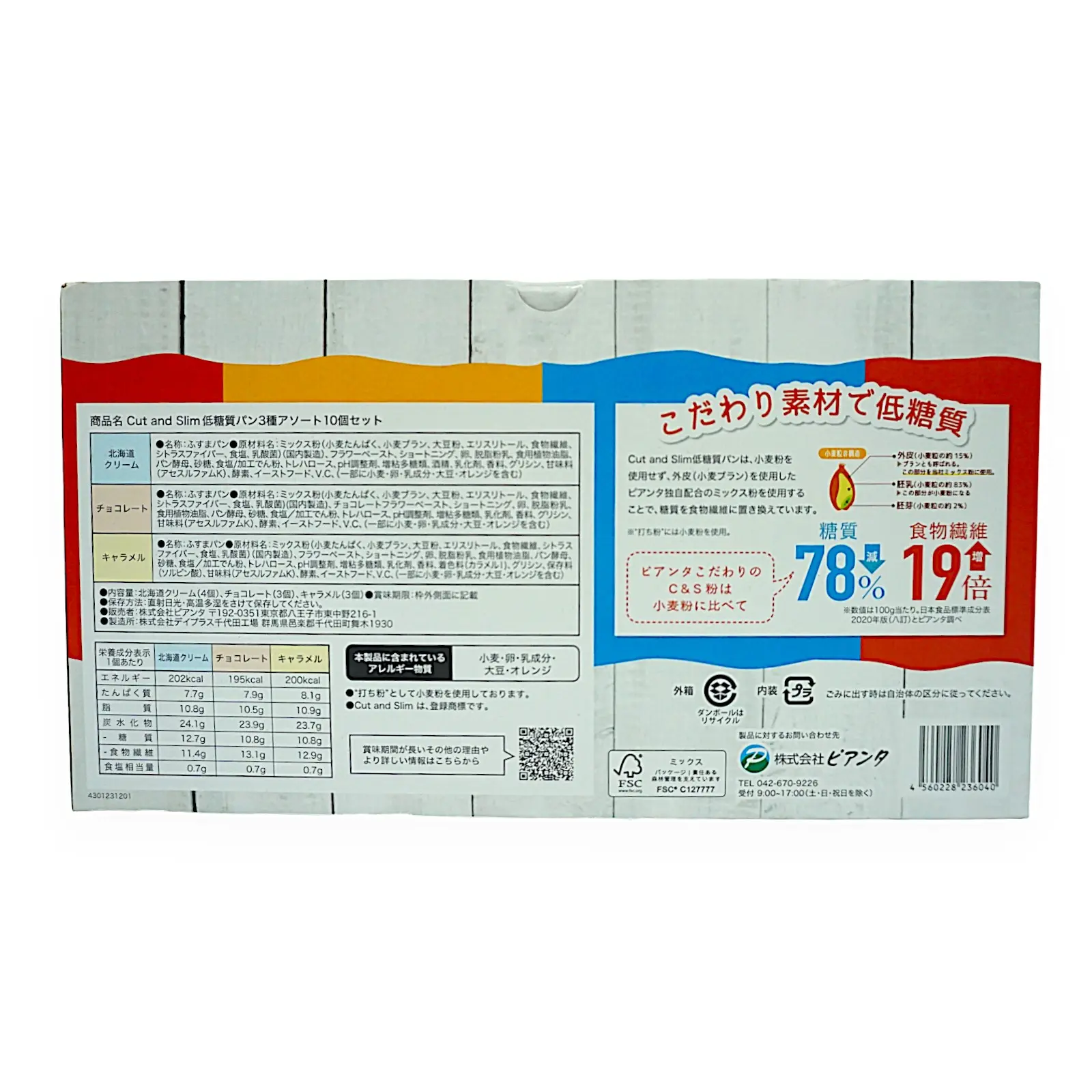 | 原材料名 | 北海道クリーム:ミックス粉(小麦たんぱく、小麦ブラン、大豆粉、エリスリトール、食物繊維、シトラスファイバー、食塩、乳酸菌)(国内製造)、フラワーペースト、ショートニング、卵、脱脂粉乳、食用植物油脂、パン酵母、砂糖、食塩/加工でん粉、トレハロース、pH調剤、増粘多糖類、酒精、乳化剤、香料、グリシン、甘味料(アセスルファムK)、酵素、イーストフード、V.C、(一部に小麦・卵・乳成分・大豆・オレンジを含む) チョコレート:ミックス粉(小麦たんぱく、小麦ブラン、大豆粉、エリスリトール、食物繊維、シトラスファイバー、食塩、乳酸菌)(国内製造)、チョコレートフラワーペースト、ショートニング、卵、脱脂粉乳、食用植物油脂、パン酵母、砂糖、食塩/加工でん粉、トレハロース、pH調整剤、増粘多糖類、乳化剤、香料、グリシン、甘味料(アセスルファムK)、酵素、イーストフード、V.C、(一部に小麦・卵・乳成分・大豆・オレンジを含む) キャラメル:ミックス粉(小麦たんぱく、小麦ブラン、大豆粉、エリスリトール、食物繊維、シトラスファイバー、食塩、乳酸菌)(国内製造)、フラワーペースト、ショートニング、卵、脱脂粉乳、食用植物油脂、パン酵母、砂糖、食塩/加工でん粉、トレハロース、pH調整剤、増粘多糖類、乳化剤、香料、着色料(カラメルⅠ)、グリシン、保存料(ソルビン酸)、甘味料(アセスルファムK)、酵素、イーストフード、V.C、(一部に小麦・卵・乳成分・大豆・オレンジを含む) |