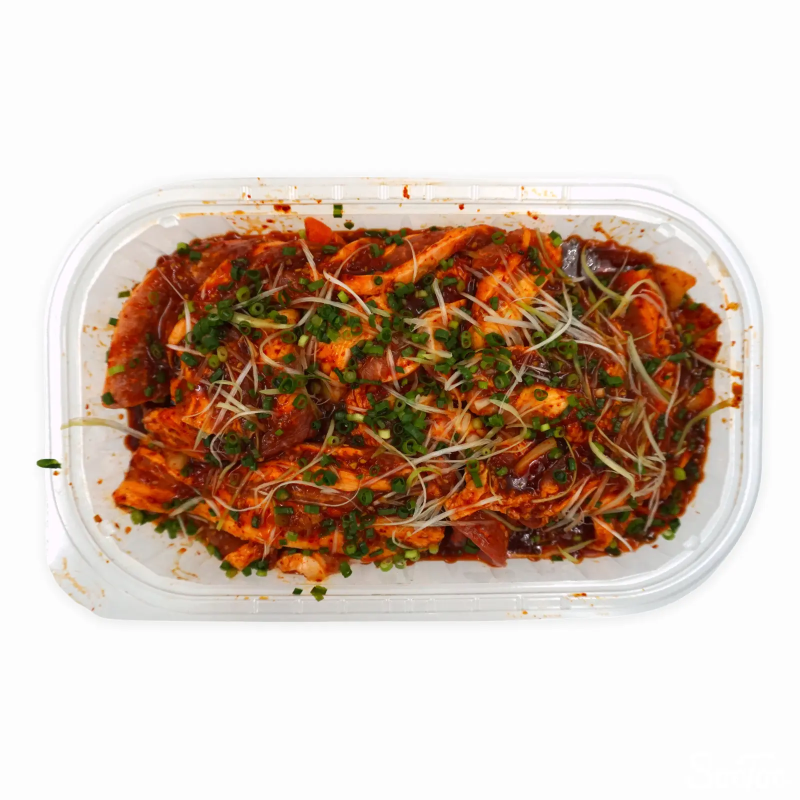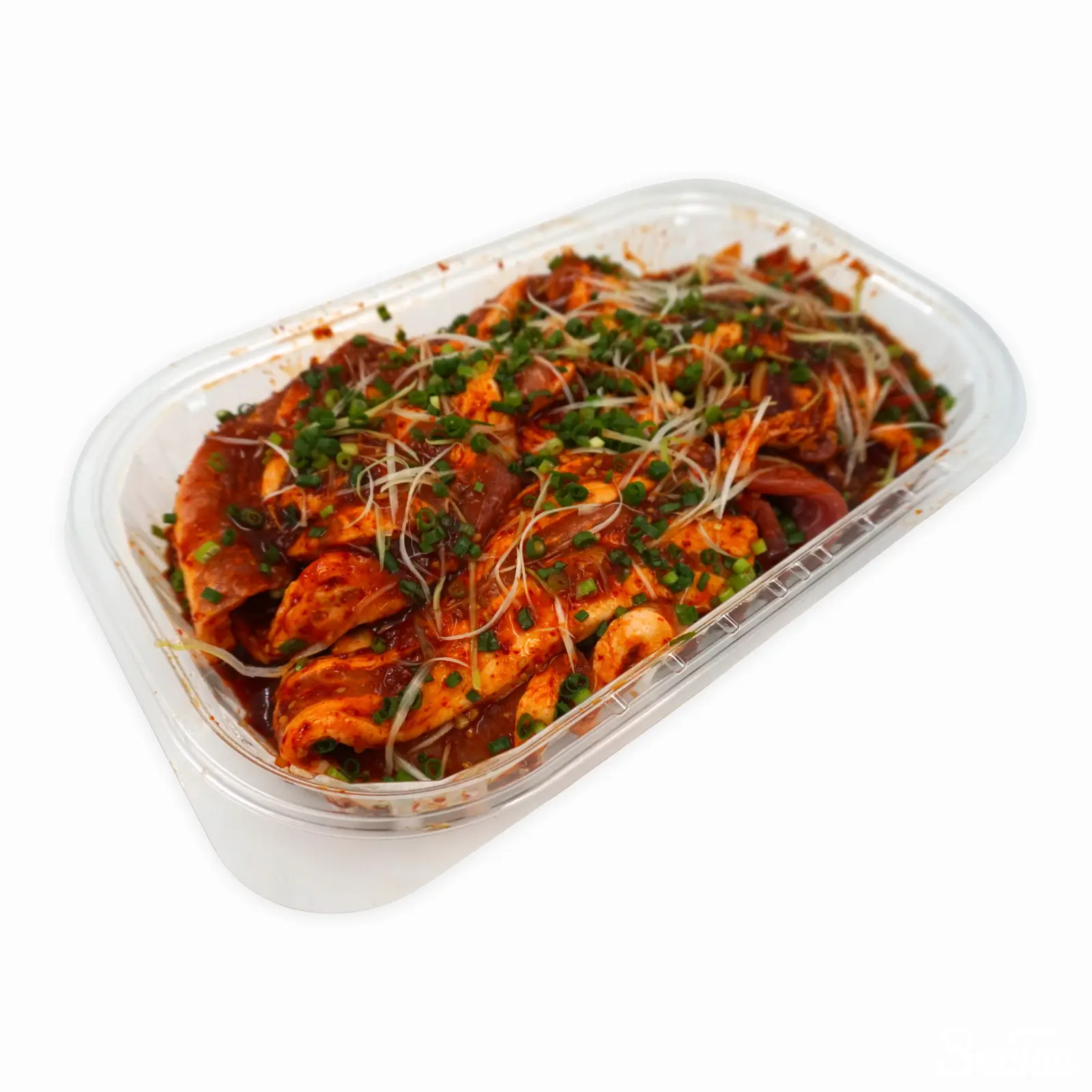 ヤンニョムの味付けがされた三元豚バラです。非加熱のため、お手元で加熱していただいて完成となります。食べやすい大きさにカットされており、ねぎを中心とした野菜のミックスも混ざっています。