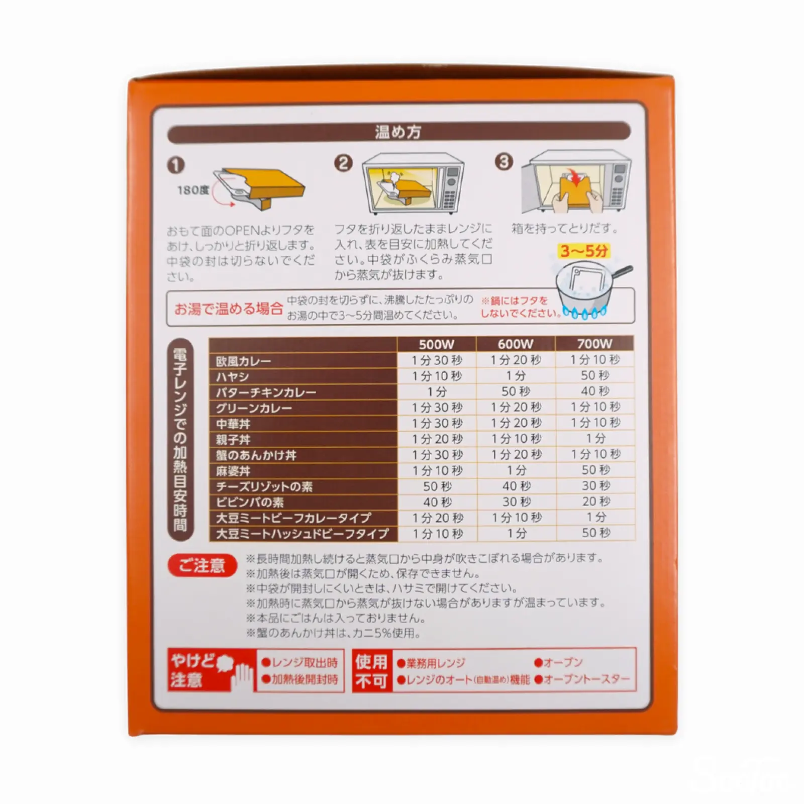 12種類のレトルトパックのセットです。欧風カレー(中辛)、バターチキンカレー(中辛)、グリーンカレー(辛口)、ハヤシ、中華丼、親子丼、蟹のあんかけ丼、麻婆丼(辛口)、ビビンバの素(辛口)、チーズリゾットの素、大豆ミートビーフカレータイプ、大豆ミートハッシュドビーフタイプが入っています。電子レンジでそのまま温めることができます。