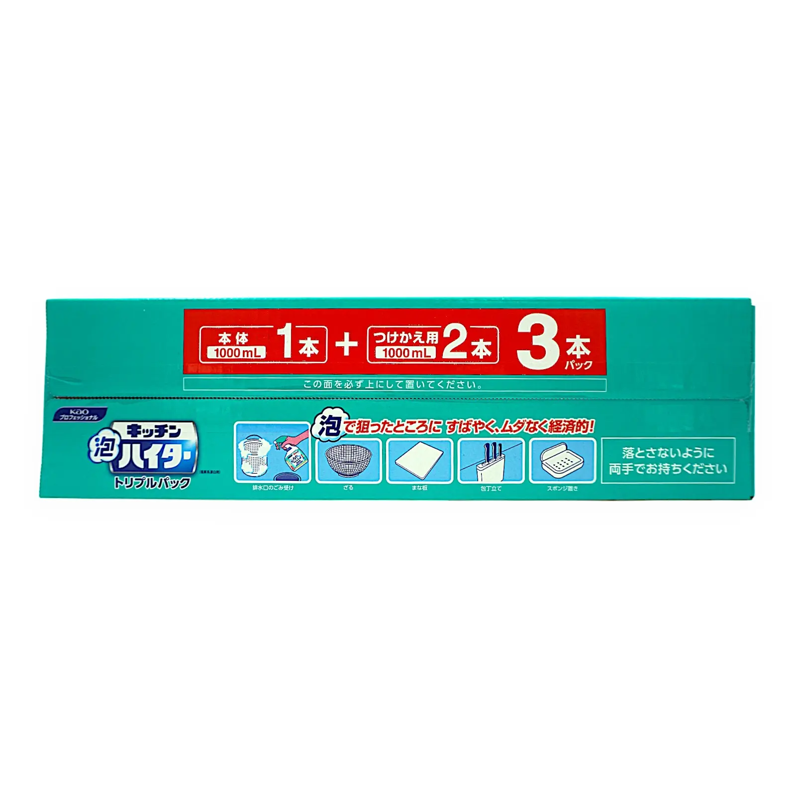 花王のキッチン泡ハイターです。本体1,000mlが1本と付替用1000mlが2本のセットになります。