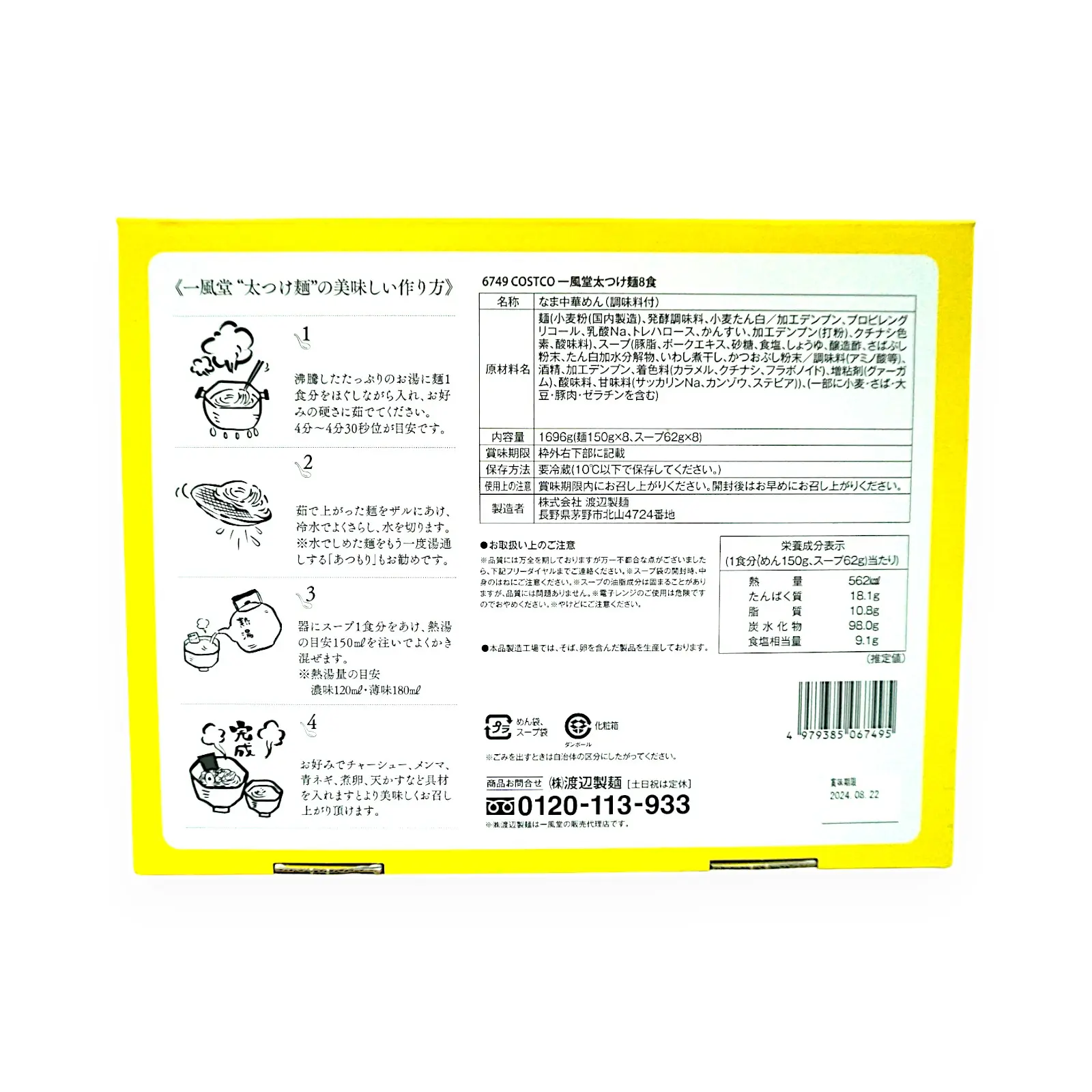 | 栄養成分表示 | (1食分(めん150g、スープ62g)当たり) 熱量562kcal、たんぱく質18.1g、脂質10.8g、炭水化物98.0g、食塩相当量9.1g |