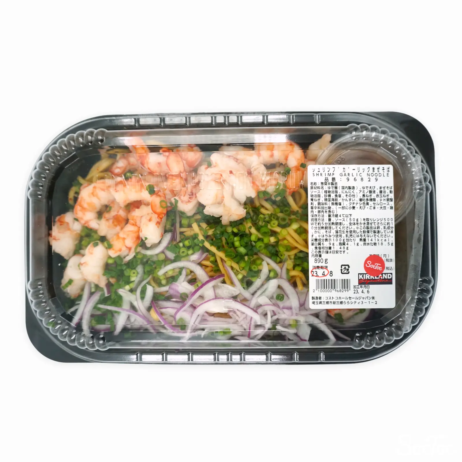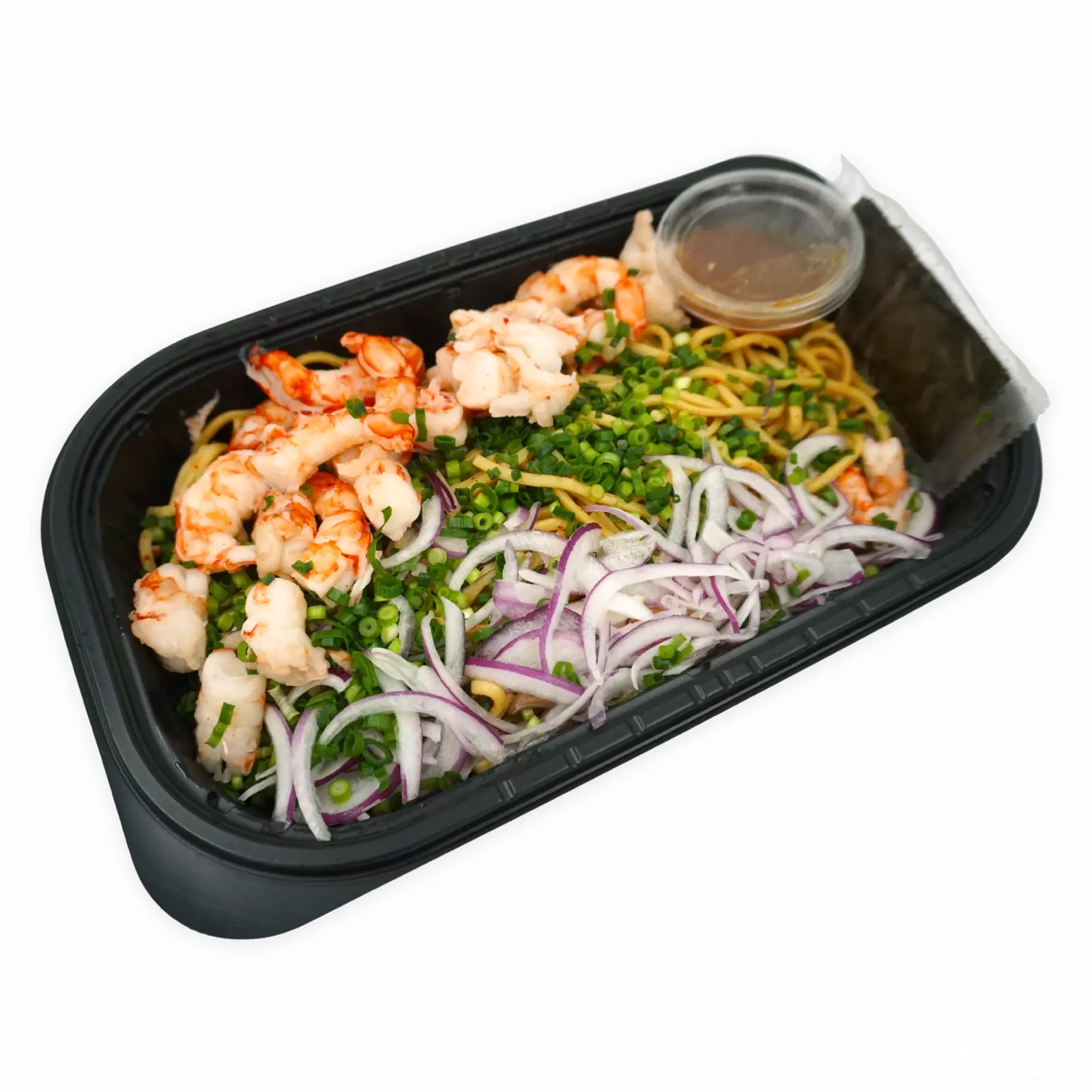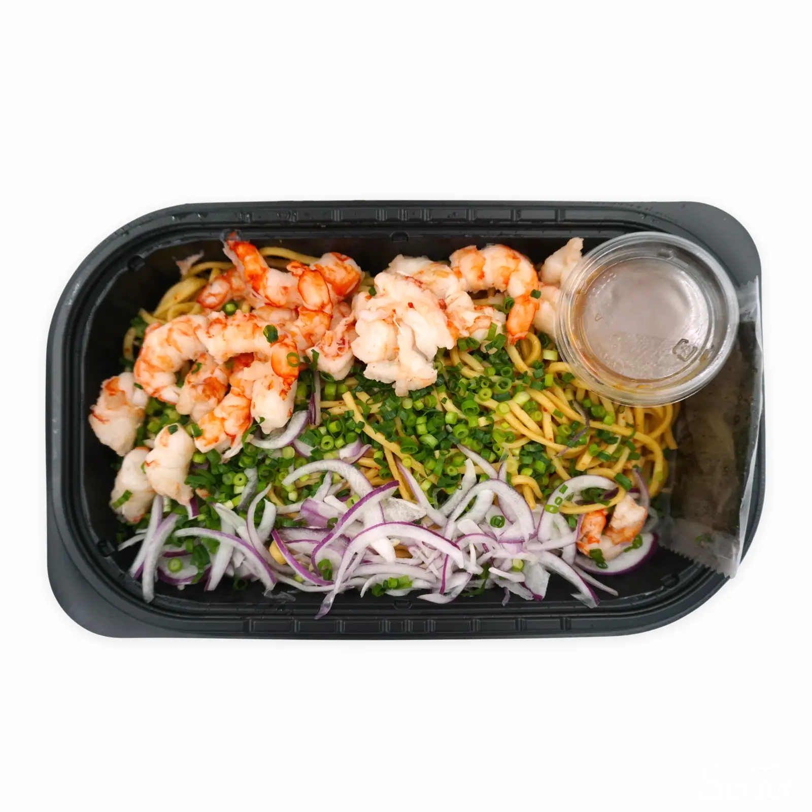 デリカコーナーにある調理済みのまぜそばです。たっぷりのエビに小葱、玉ねぎと茹で麺のセットになっています。にんにくの入った醤油ベースのソースがついており、お好みでかけてお召し上がりください。