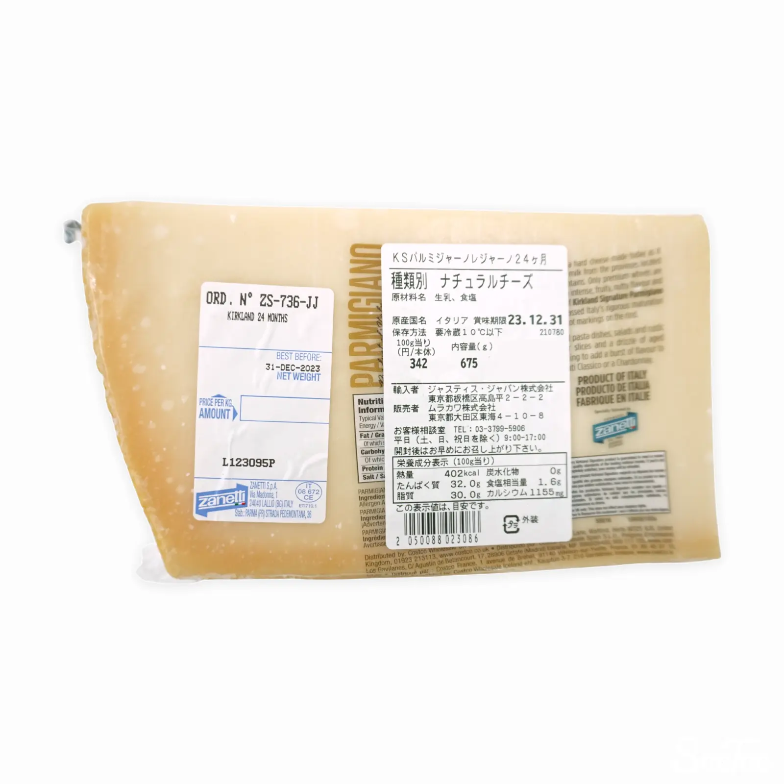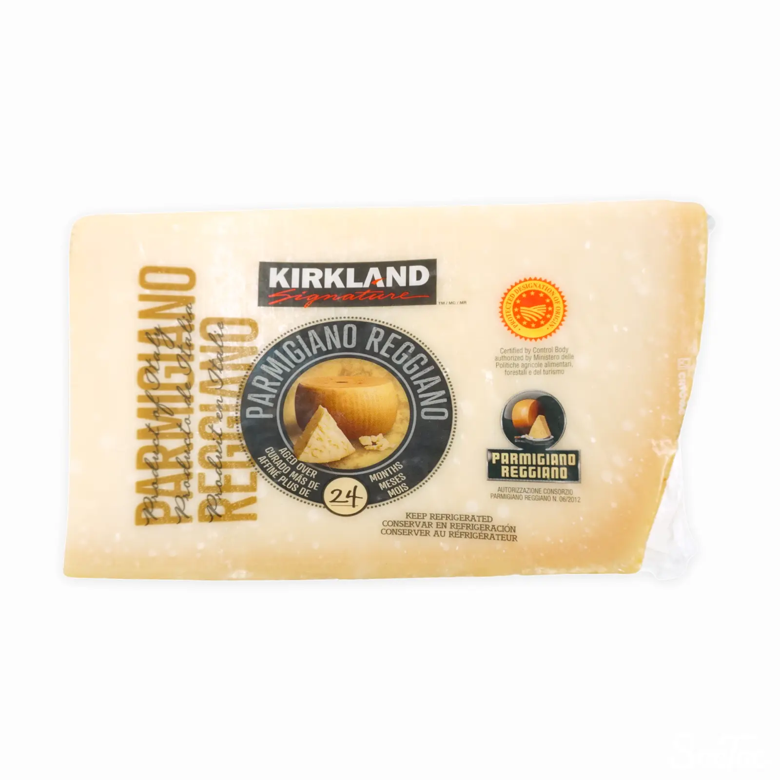 コストコのプライベートブランドである KIRKLAND SIGNATURE より、24ヶ月熟成のパルミジャーノ・レッジャーノです。ザネッティが製造しています。ハードタイプのチーズのため、そのままカットされるほか、パスタ等に削って載せても美味しくお召し上がりいただけます。