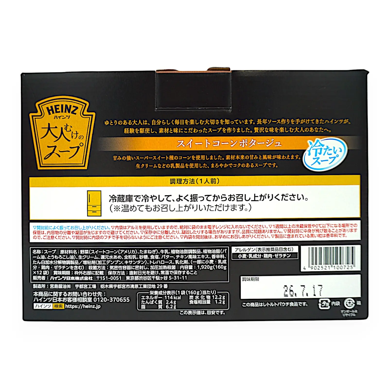 | 原材料名 | 野菜(スイートコーン(アメリカ)、たまねぎ)、牛乳、植物油脂調製品、植物油脂(パーム油、とうもろこし油)、生クリーム、還元水あめ、全粉乳、砂糖、食塩、バター、チキン風味エキス、香辛料、たん白加水分解物調製品/増粘剤(加工デンプン、キサンタン)、トレハロース、乳化剤、(一部に小麦・乳成分・鶏肉・ゼラチンを含む) |