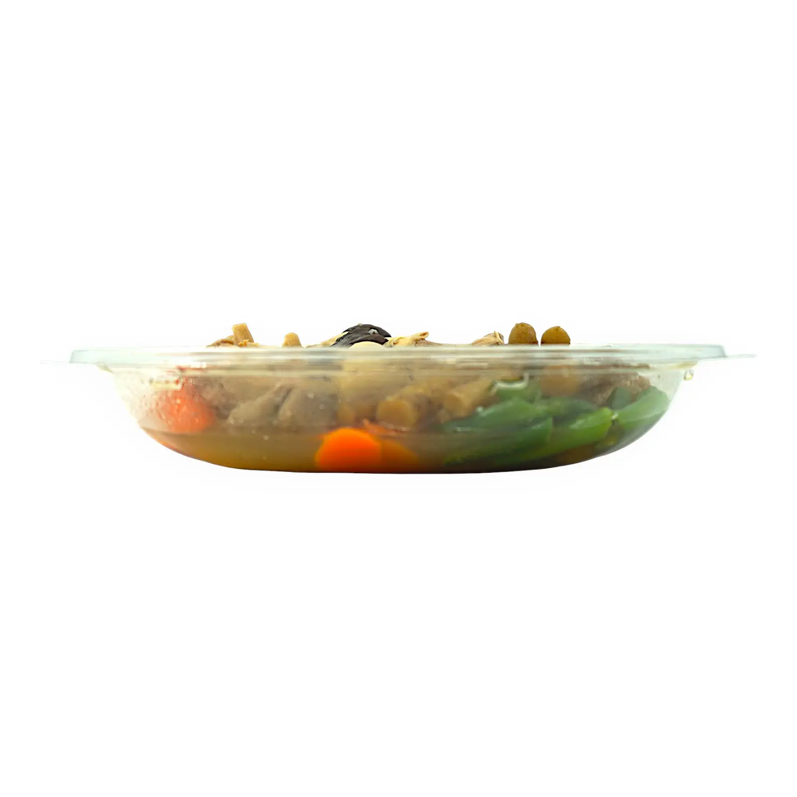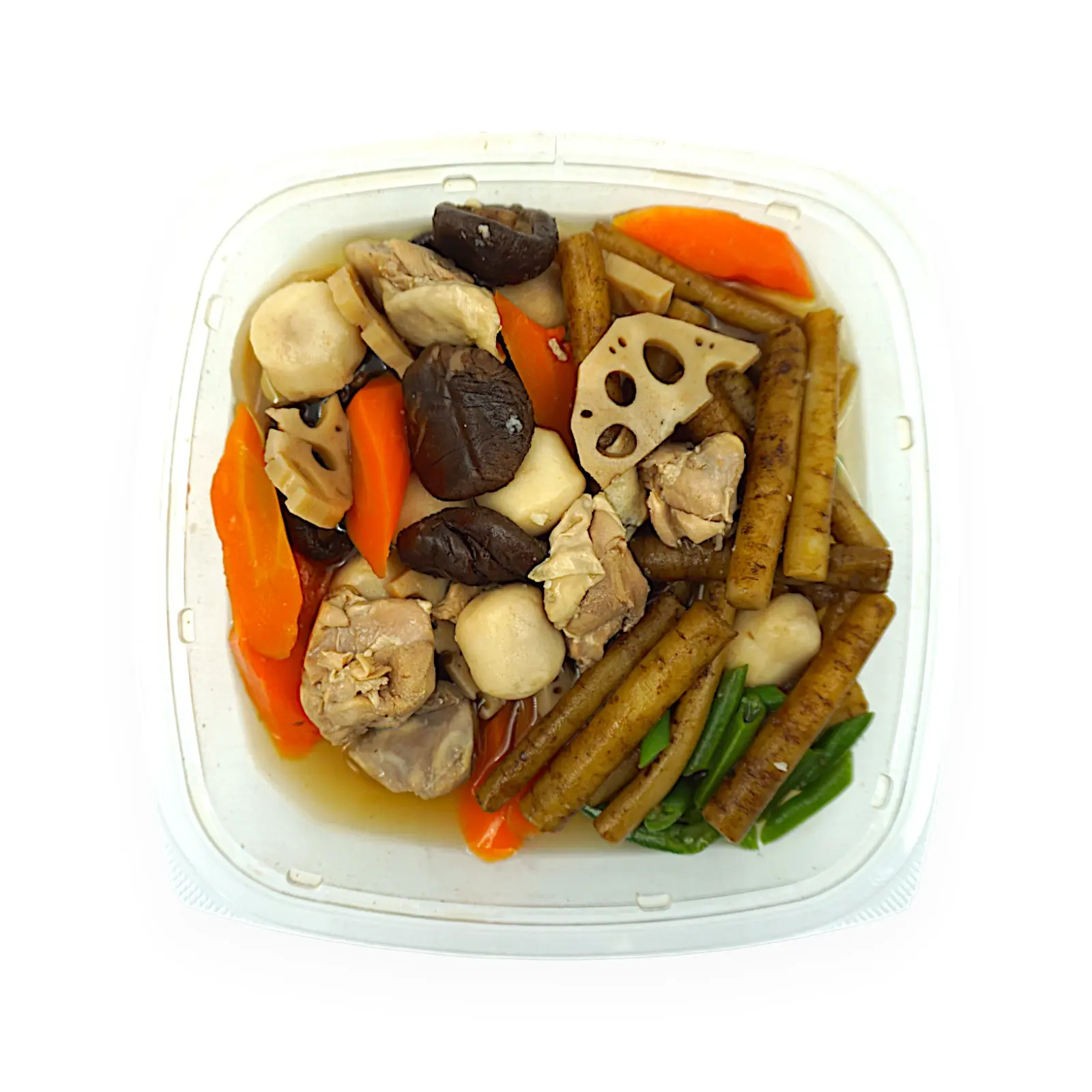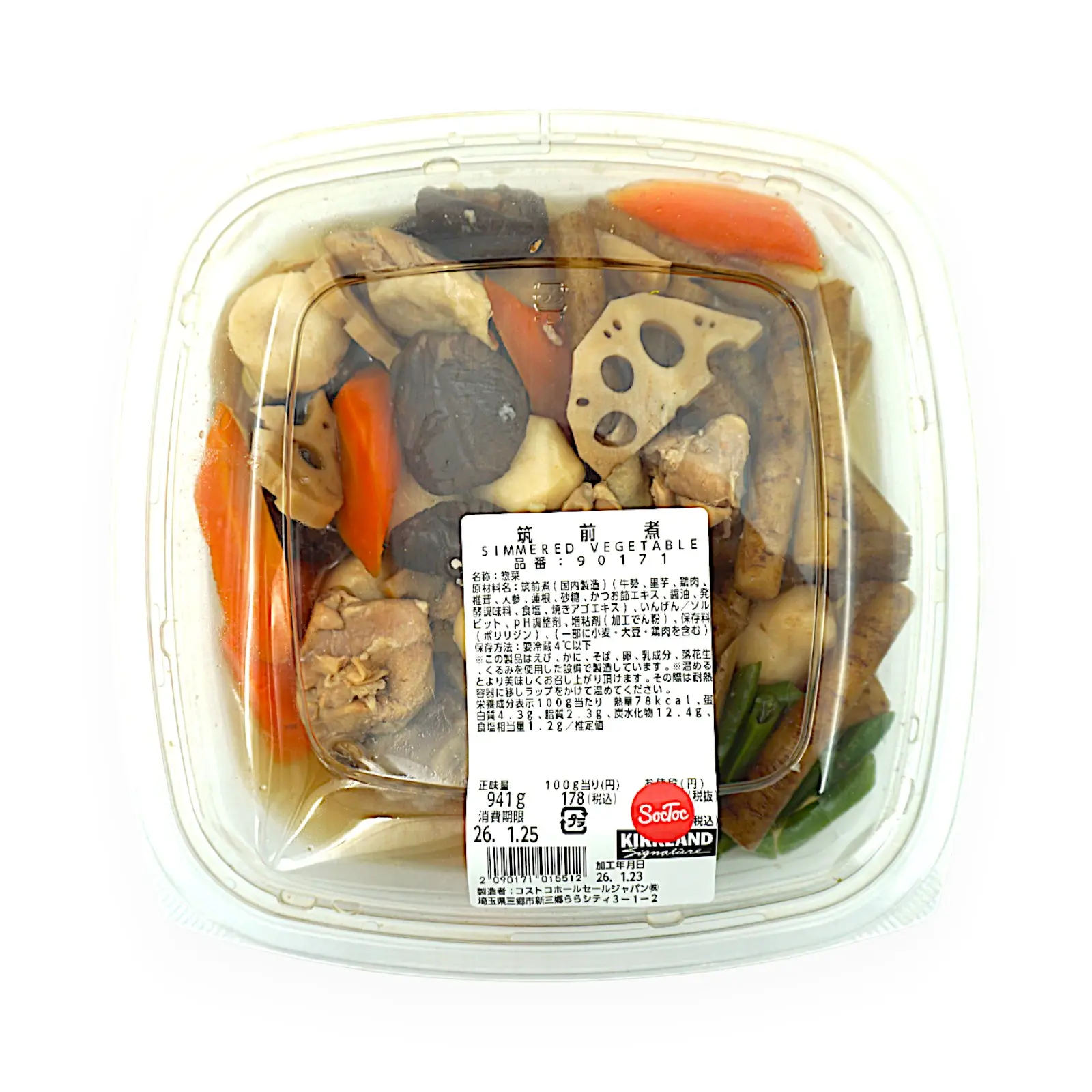 筑前煮(国内製造)(牛蒡、里芋、鶏肉、椎茸、人参、蓮根、砂糖、かつお節エキス、醤油、発酵調味料、食塩、焼きアゴエキス)、いんげん/ソルビット、PH調整剤、増粘剤(加工でん粉)、保存料(ポリリジン)、(一部に小麦・大豆・鶏肉を含む)