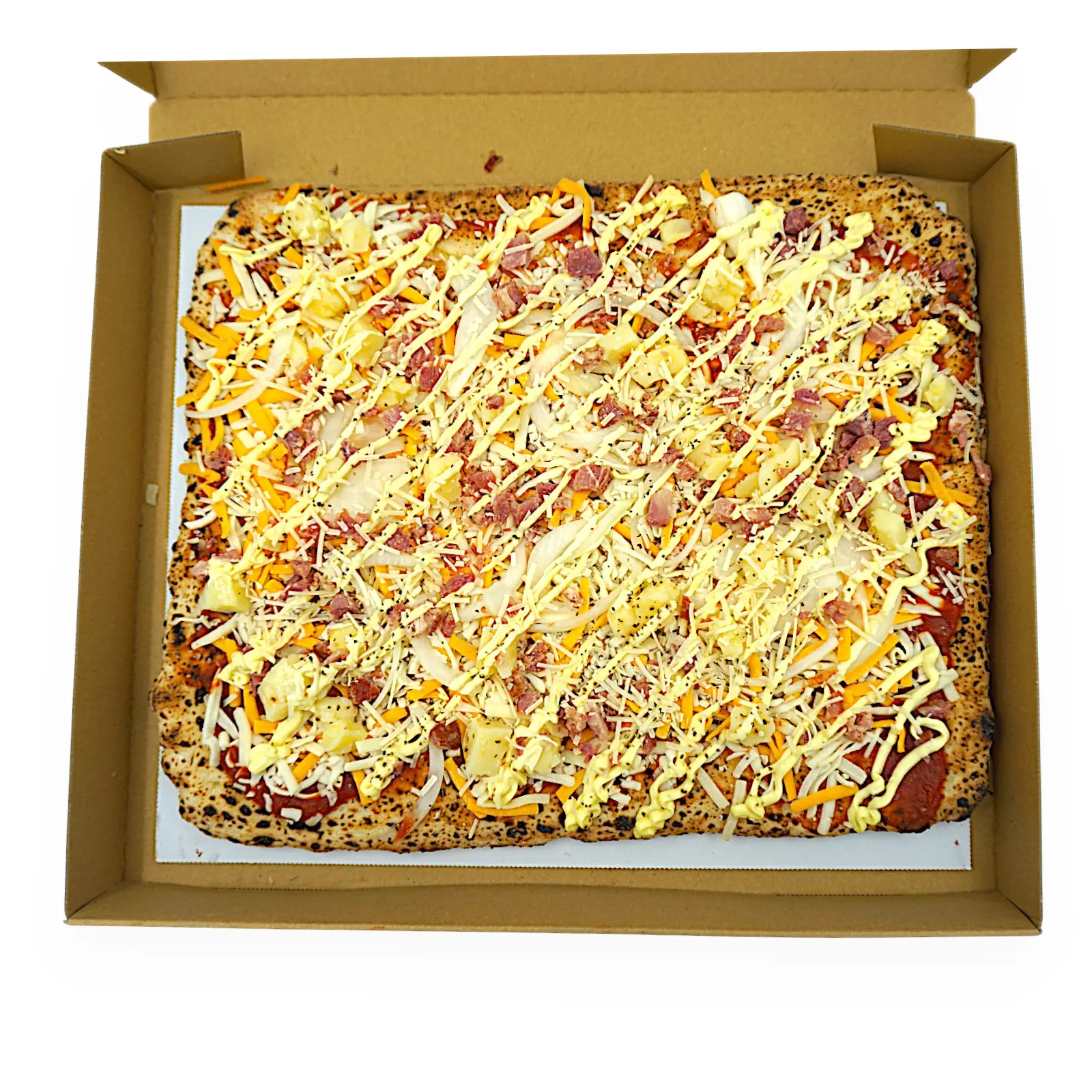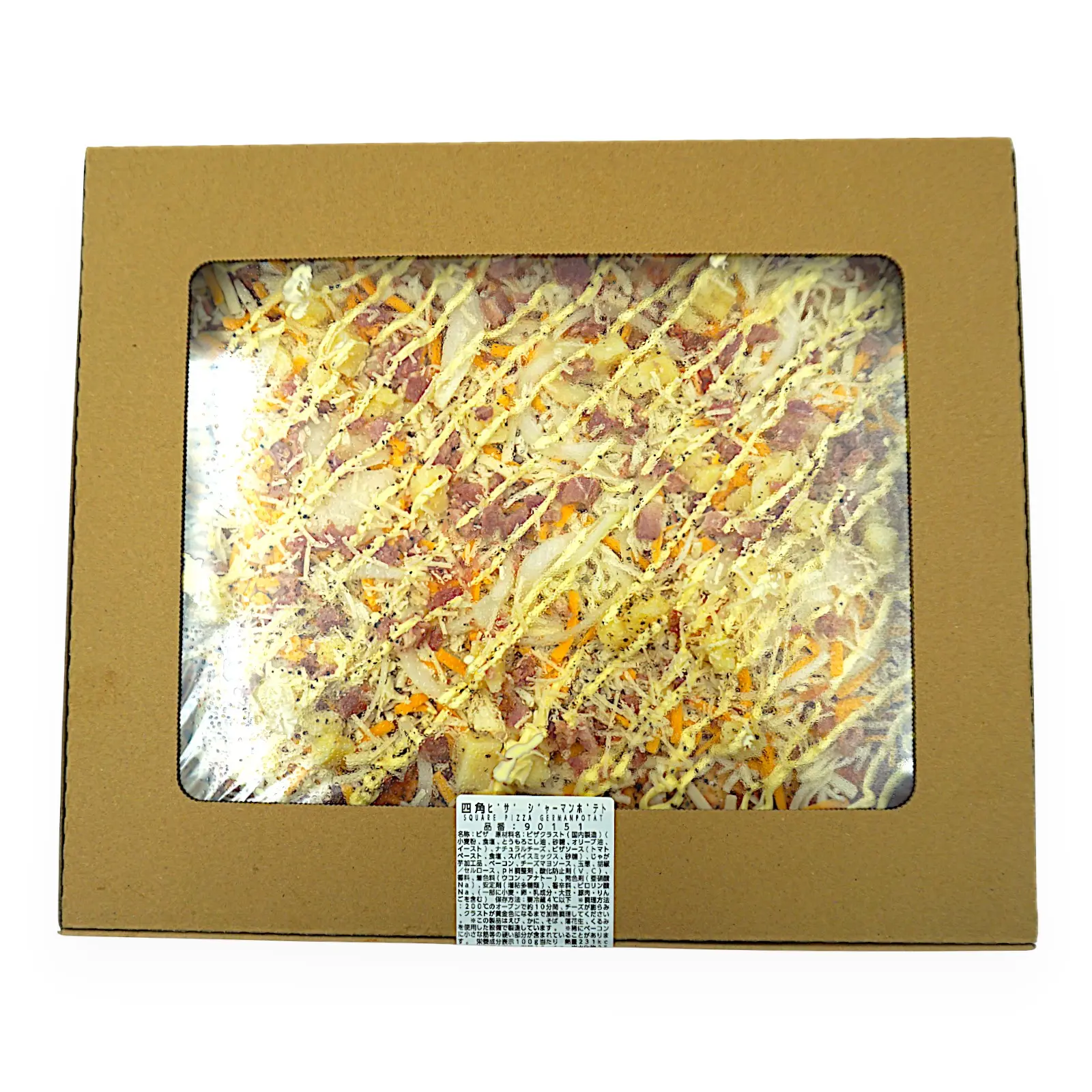 | 原材料名 | ピザクラスト(国内製造)(小麦粉、食塩、とうもろこし油、砂糖、オリーブ油、イースト)、ナチュラルチーズ、ピザソース(トマトペースト、食塩、スパイスミックス、砂糖)、じゃが芋加工品、ベーコン、チーズマヨソース、玉葱、胡椒/セルロース、pH調整剤、酸化防止剤(V.C)、香料、着色料(ウコン、アナトー)、発色剤(亜硝酸Na)、安定剤(増粘多糖類)、香辛料、ピロリン酸Na、(一部に小麦・卵・乳成分・大豆・豚肉・りんごを含む) |