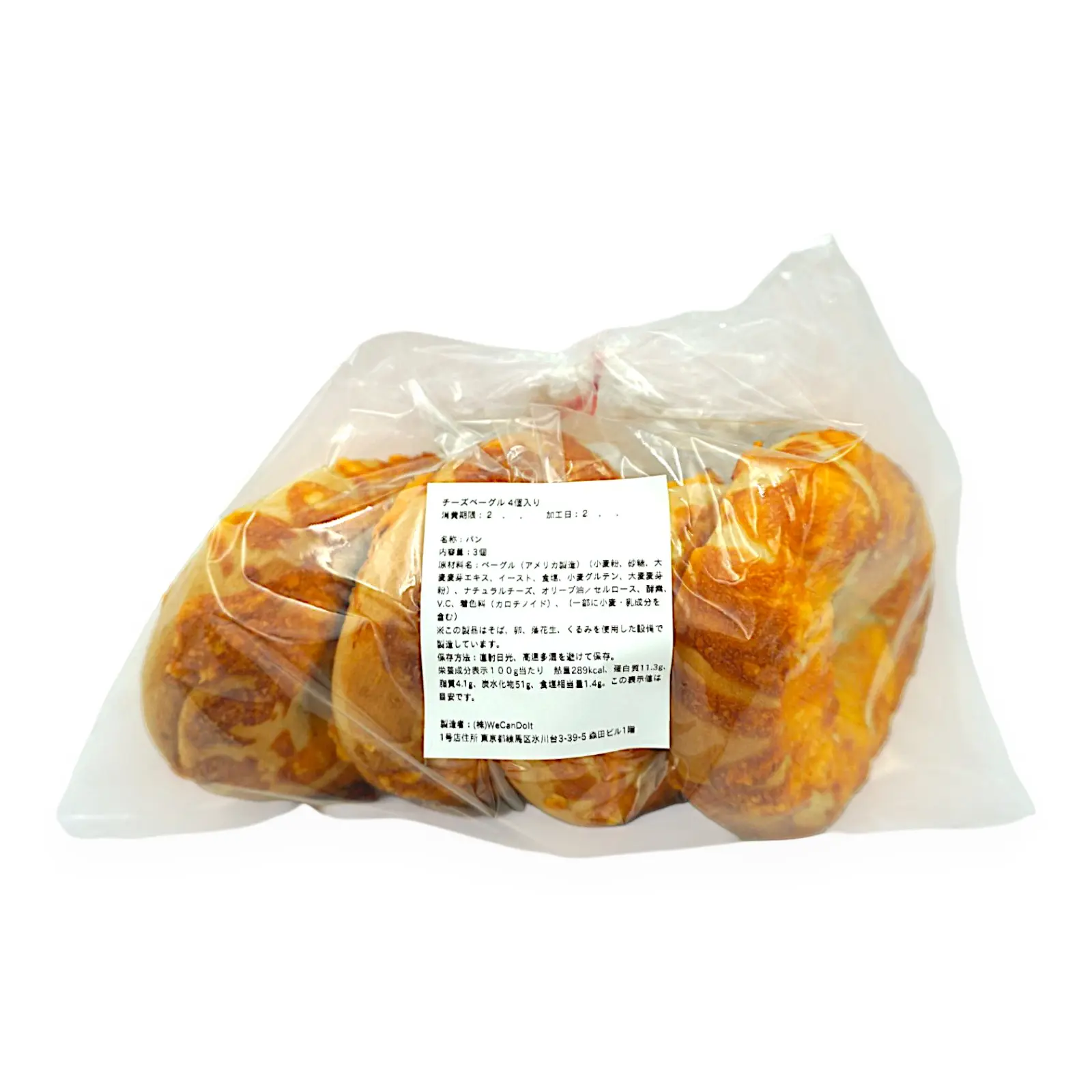 ベーグル(アメリカ製造)(小麦粉、砂糖、大麦麦芽エキス、イースト、食塩、小麦グルテン、大麦麦芽粉)、ナチュラルチーズ、オリーブ油/セルロース、酵素、V.C、着色料(カロチノイド)、(一部に小麦・乳成分を含む)