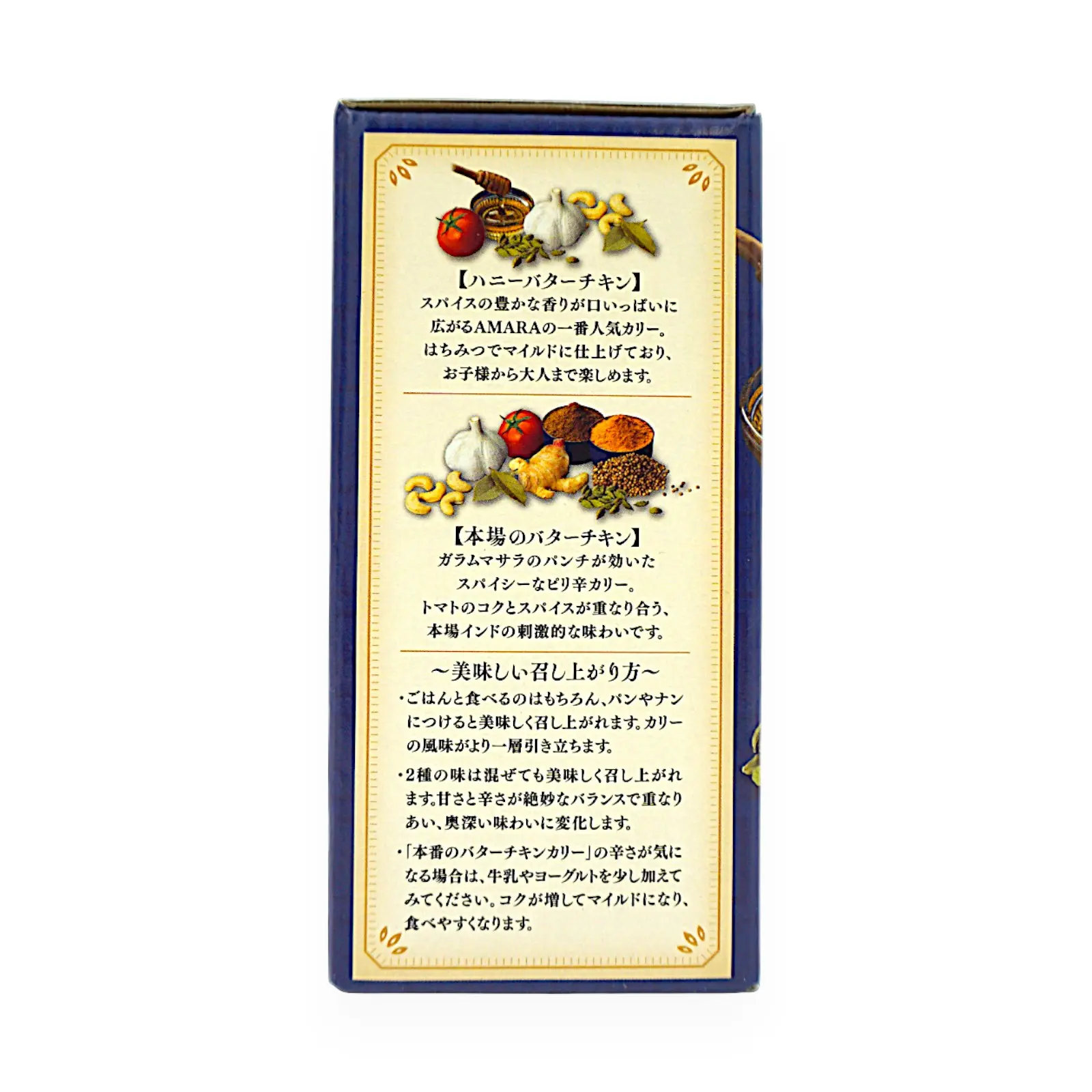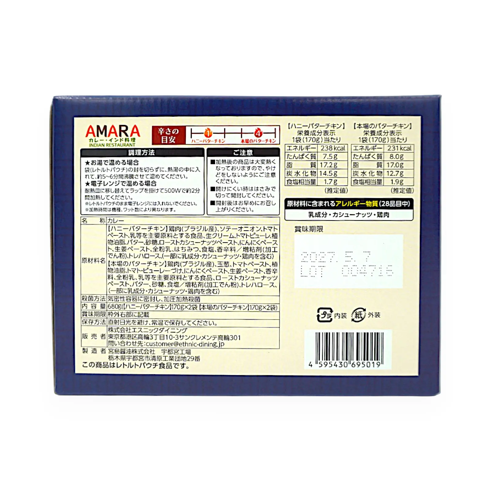 | 原材料名 | 【ハニーバターチキン】鶏肉(ブラジル産)、ソテーオニオン、トマトペースト、乳等を主要原料とする食品、生クリーム、トマトピューレ、植物油脂、バター、砂糖、ローストカシューナッツペースト、にんにくペースト、生姜ペースト、全粉乳、はちみつ、食塩、香辛料/増粘剤(加工でん粉)、トレハロース、(一部に乳成分・カシューナッツ・鶏肉を含む) 【本場のバターチキン】鶏肉(ブラジル産)、玉葱、トマトペースト、植物油脂、トマト・ピューレーづけ、にんにくペースト、生姜ペースト、香辛料、全粉乳、乳等を主要原料とする食品、ローストカシューナッツペースト、バター、砂糖、食塩/増粘剤(加工でん粉)、トレハロース、(一部に乳成分・カシューナッツ・鶏肉を含む) |