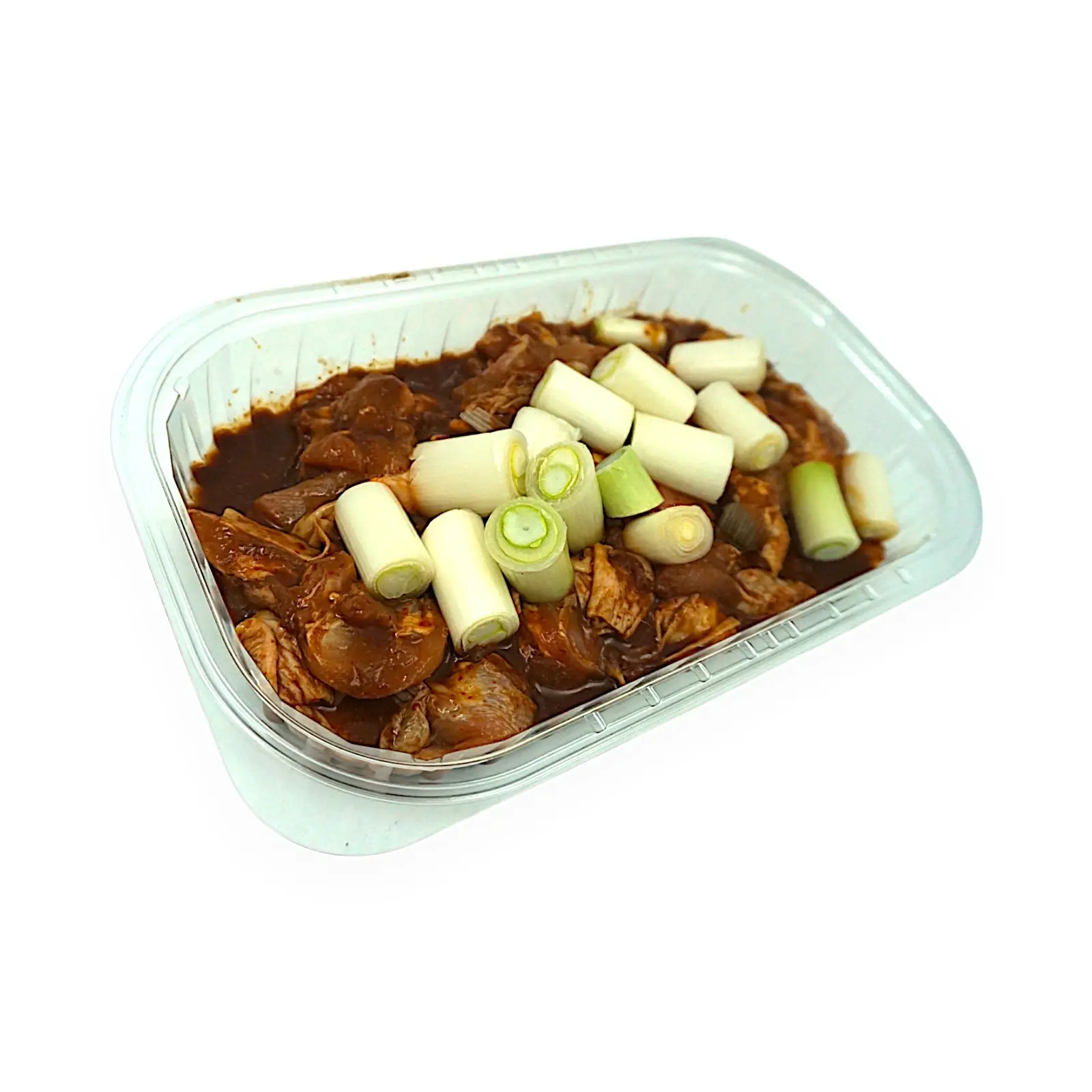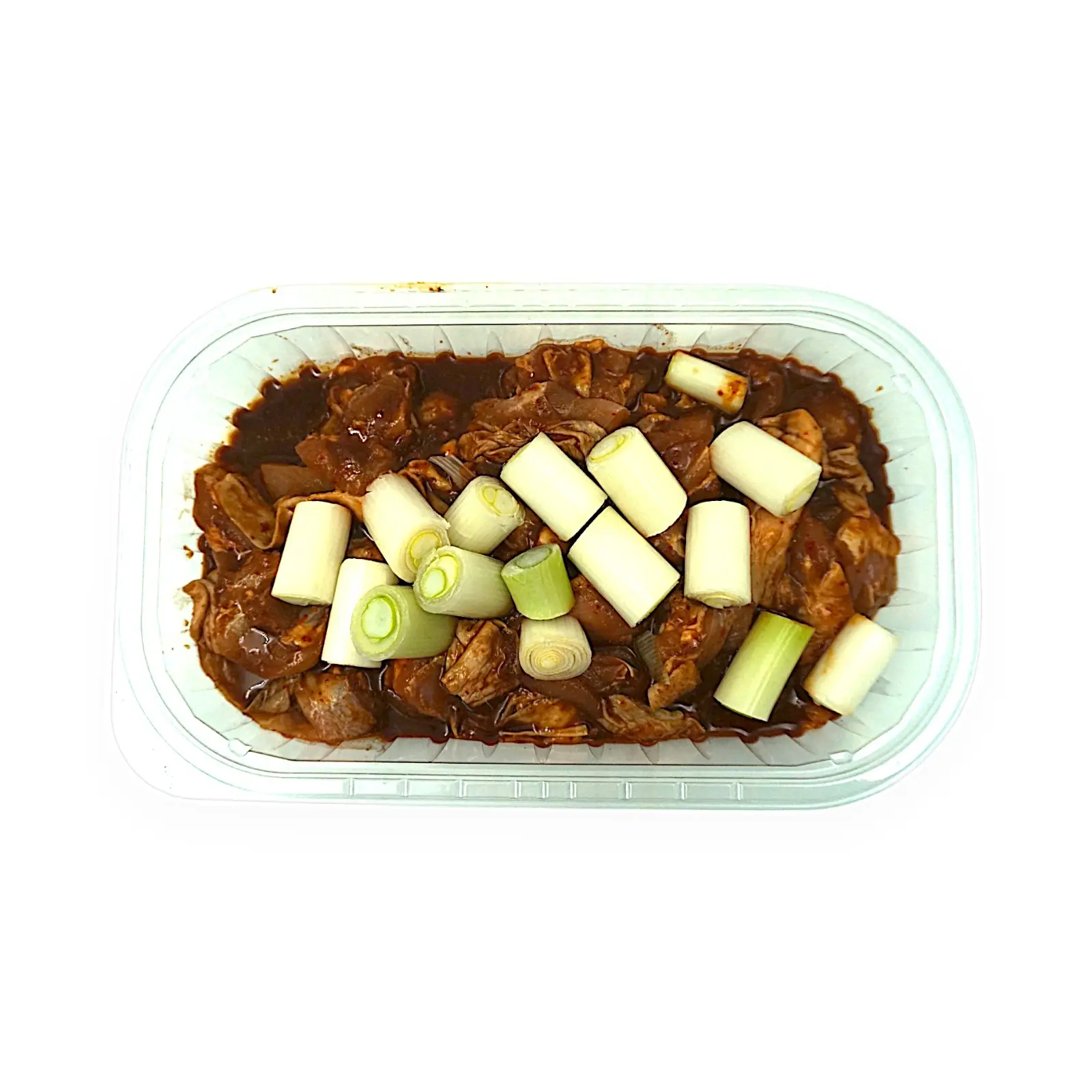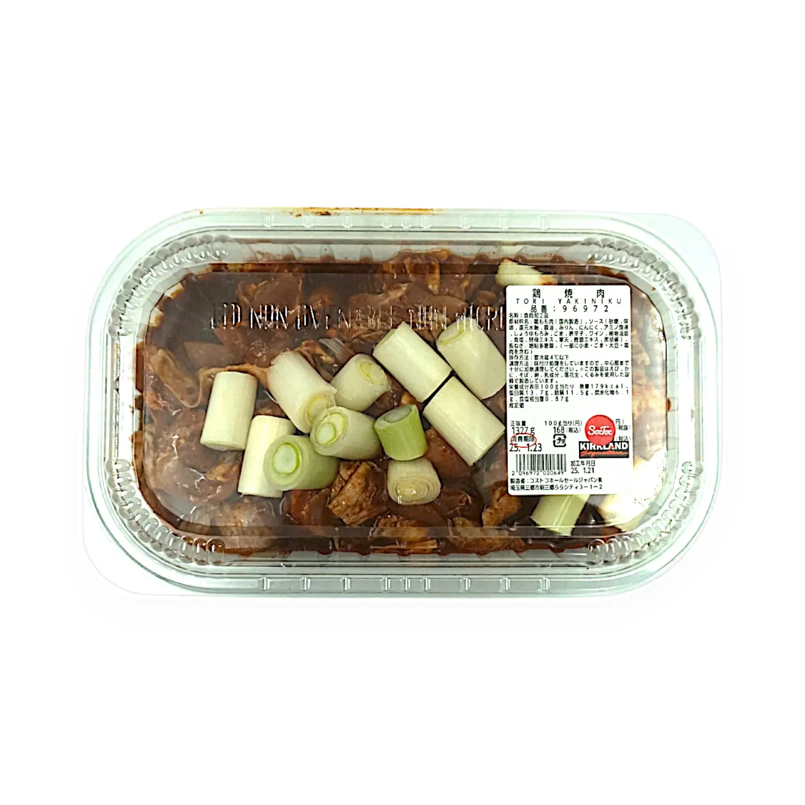 醤油や味噌で味付けされた鶏肉と、大きめにカットされたネギが入っています。フライパンで加熱して完成です。